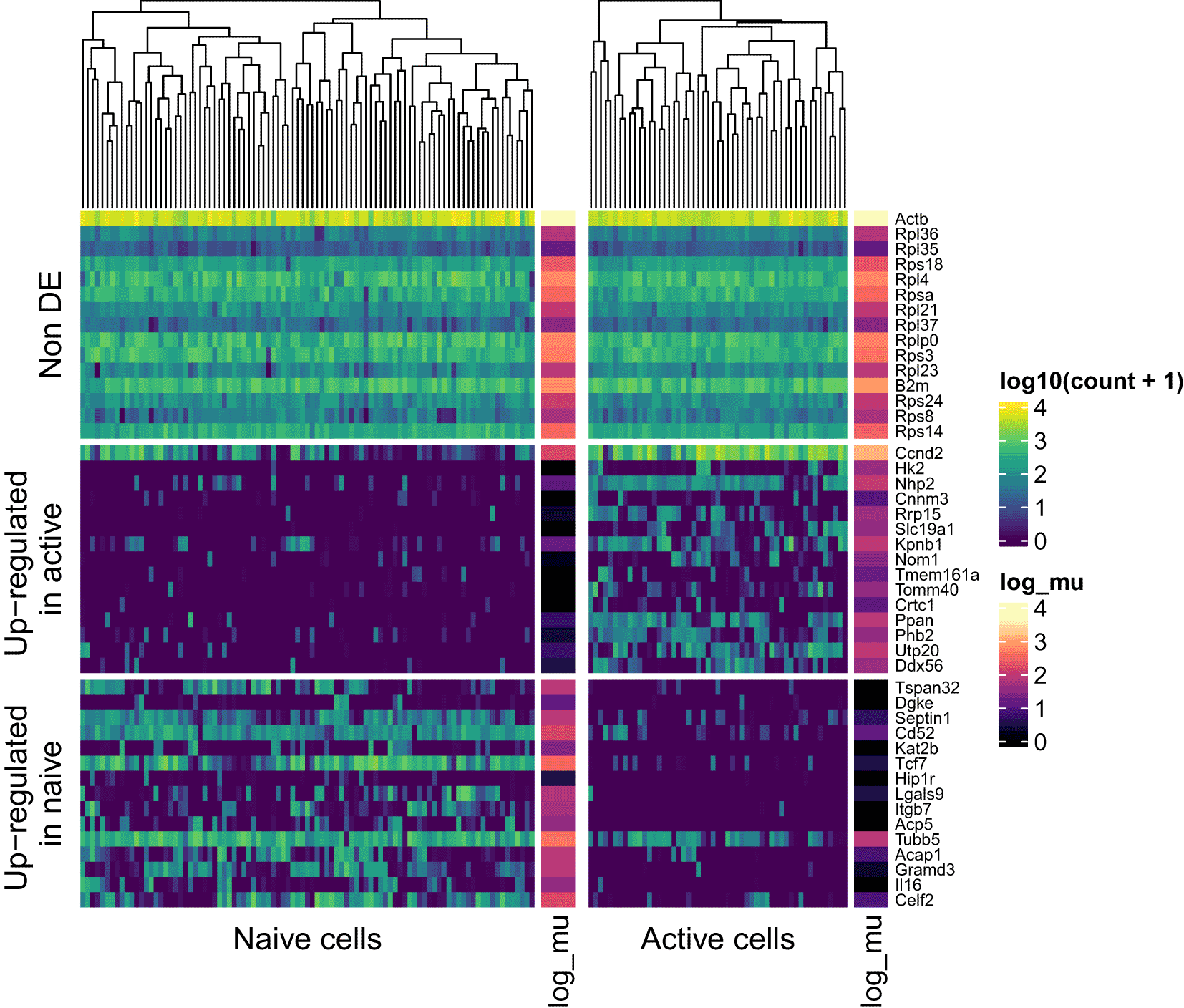 Genes are stratified according to their differential expression status (non differentially expressed; upregulated in naive or active cells). For each group, 15 example genes are shown. These were selected according to the ranking of their associated tail posterior probabilities associated to the differential mean expression test. Colour indicates expression level; colour bars on the right of heatmap segments indicate the inferred mean expression level (in log scale) for each gene in each population.
