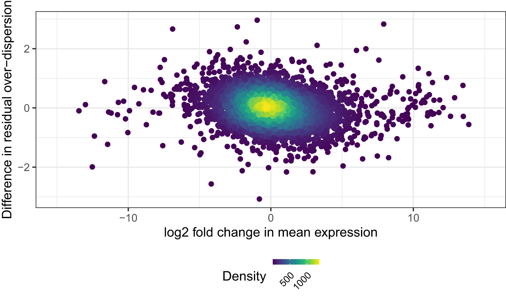 ## combine results of differential mean and residual over-dispersion tests table_de_combined <- merge(table_de_mean, table_de_resdisp) ## merge with some summary statistics about genes gene_tests <- data.frame( "GeneName" = rownames(dc_naive), "ExpPropNaive" = rowMeans(dc_naive > 0), "ExpPropActive" = rowMeans(dc_active > 0), "nExpPropNaive" = rowSums(dc_naive > 0), "nExpPropActive" = rowSums(dc_active > 0) ) table_combined_genes <- merge(table_de_combined, gene_tests) ## create list of generic plot parameters to use across a few plots plot_params <- list( geom_pointdensity(), scale_colour_viridis(name = "Density"), theme( # text = element_text(size = rel(3)), legend.position = "bottom", legend.text = element_text(angle = 45, size = 8, hjust = 1, vjust = 1), legend.key.size = unit(0.018, "npc") ) ) ## plot log2FC against difference of residual over-dispersion ggplot(table_de_combined) + aes(MeanLog2FC, ResDispDistance) + plot_params + xlim(-15, 15) + labs( x = "log2 fold change in mean expression", y = "Difference in residual over-dispersion" )