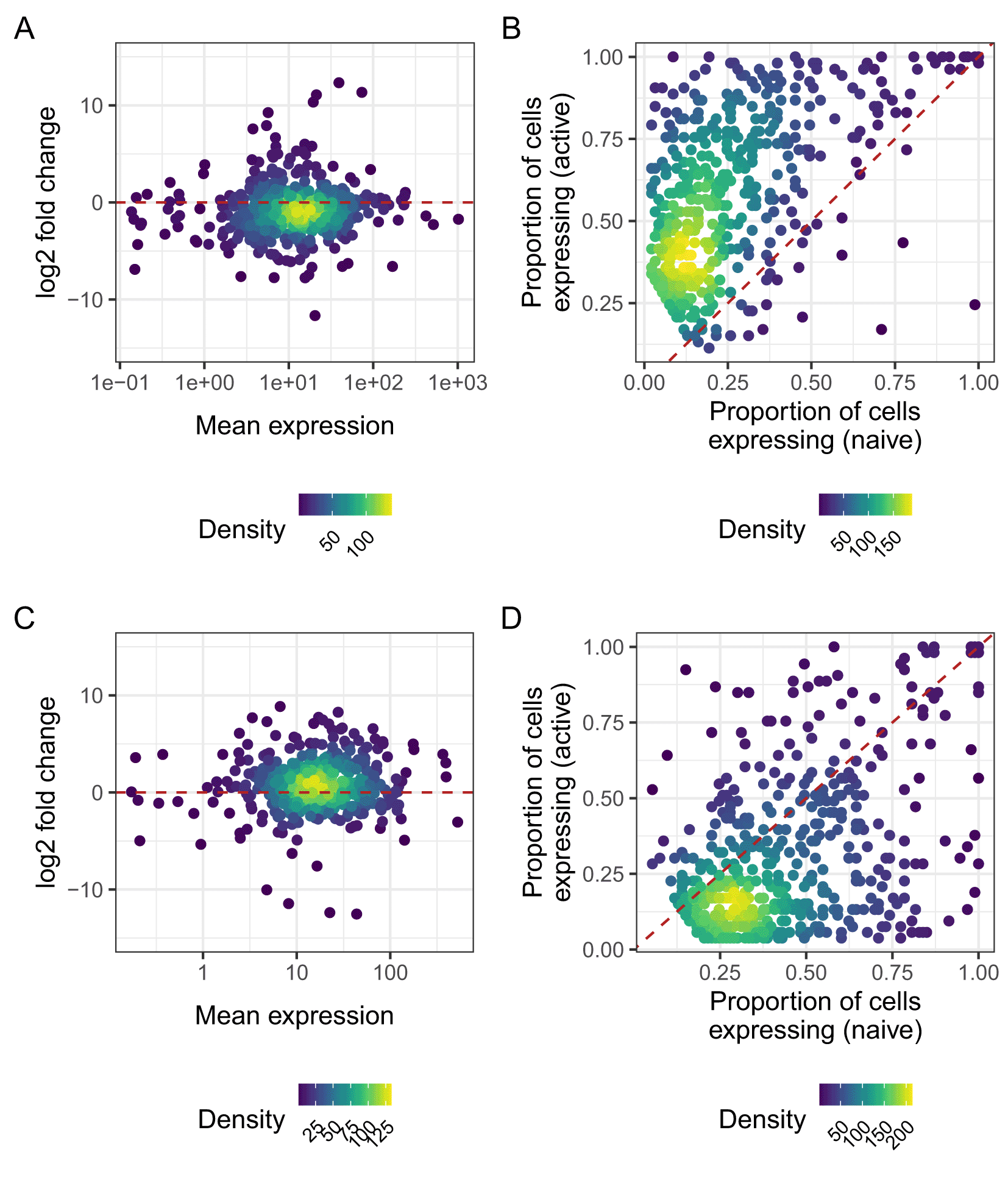 B, D: Proportion of expressed cells for genes, with higher residual over-dispersion in naive cells (B) and active (D) cells. Dashed red lines in panels A and C represent a log fold change of zero, meaning no change in average expression. Dashed red lines in panels B and D represent the line described by y=x, representing equal detection levels in both populations.