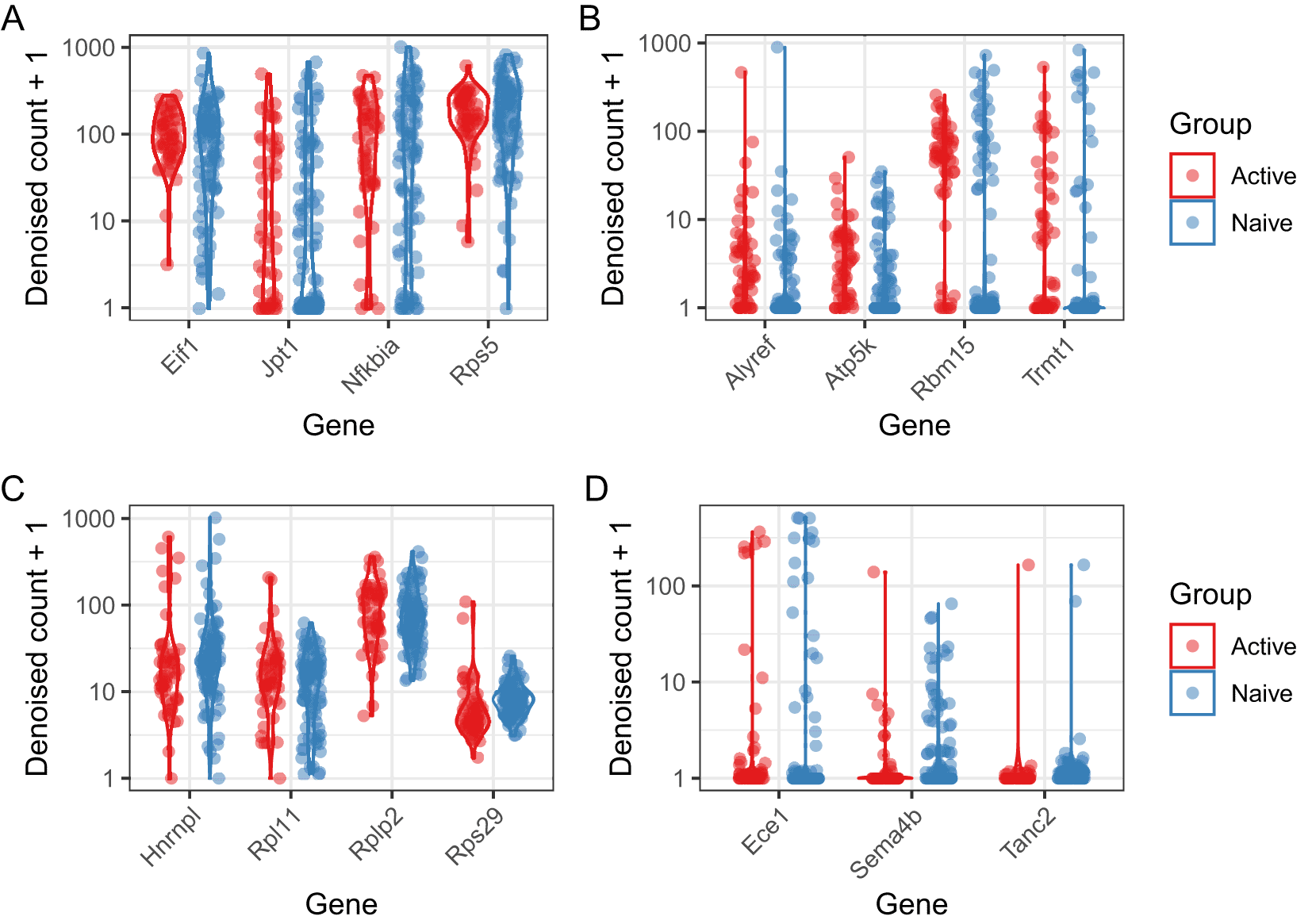 A: Four genes with higher residual over-dispersion in naive cells, and similar levels of detection in active and naive populations. B: Four genes with higher residual over-dispersion in naive cells and different levels of detection in naive and active cells. C: Four genes with higher residual over-dispersion in active cells and similar levels of detection in naive and active cells. D: Three genes with higher residual over-dispersion in active cells and different levels of detection in naive and active cells.