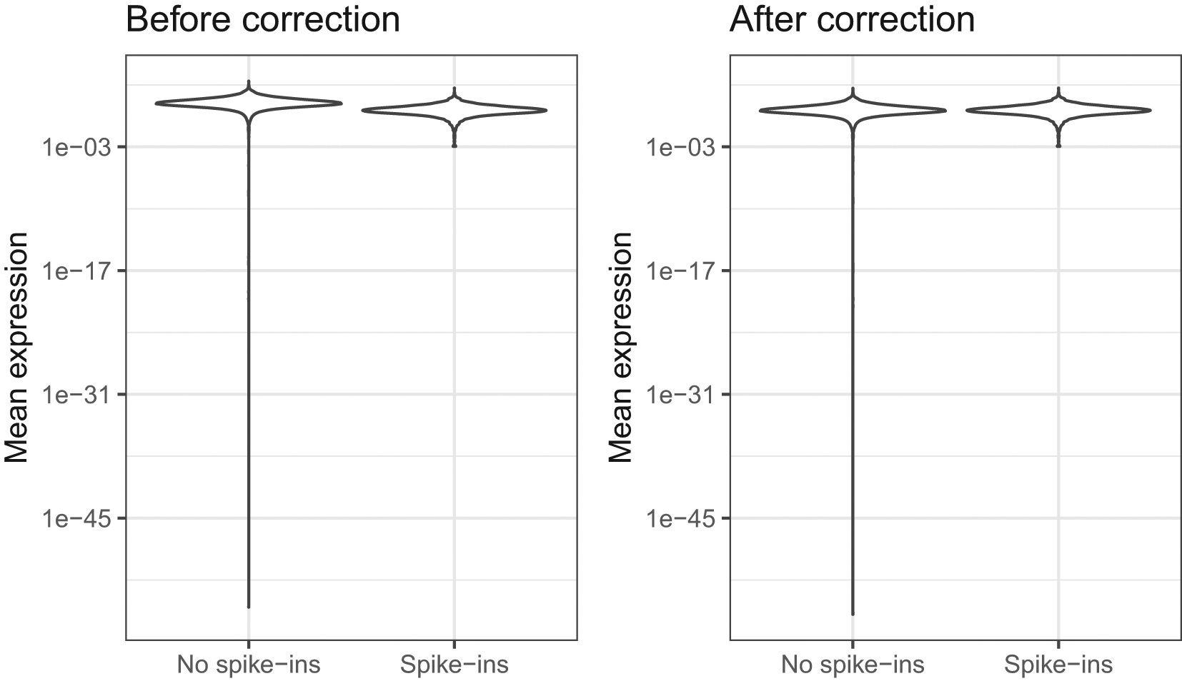 BASiCS_PlotOffset(chain_naive_nospikes, chain_naive, GroupLabel1 = "No spike-ins", GroupLabel2 = "Spike-ins", Type = "before-after")