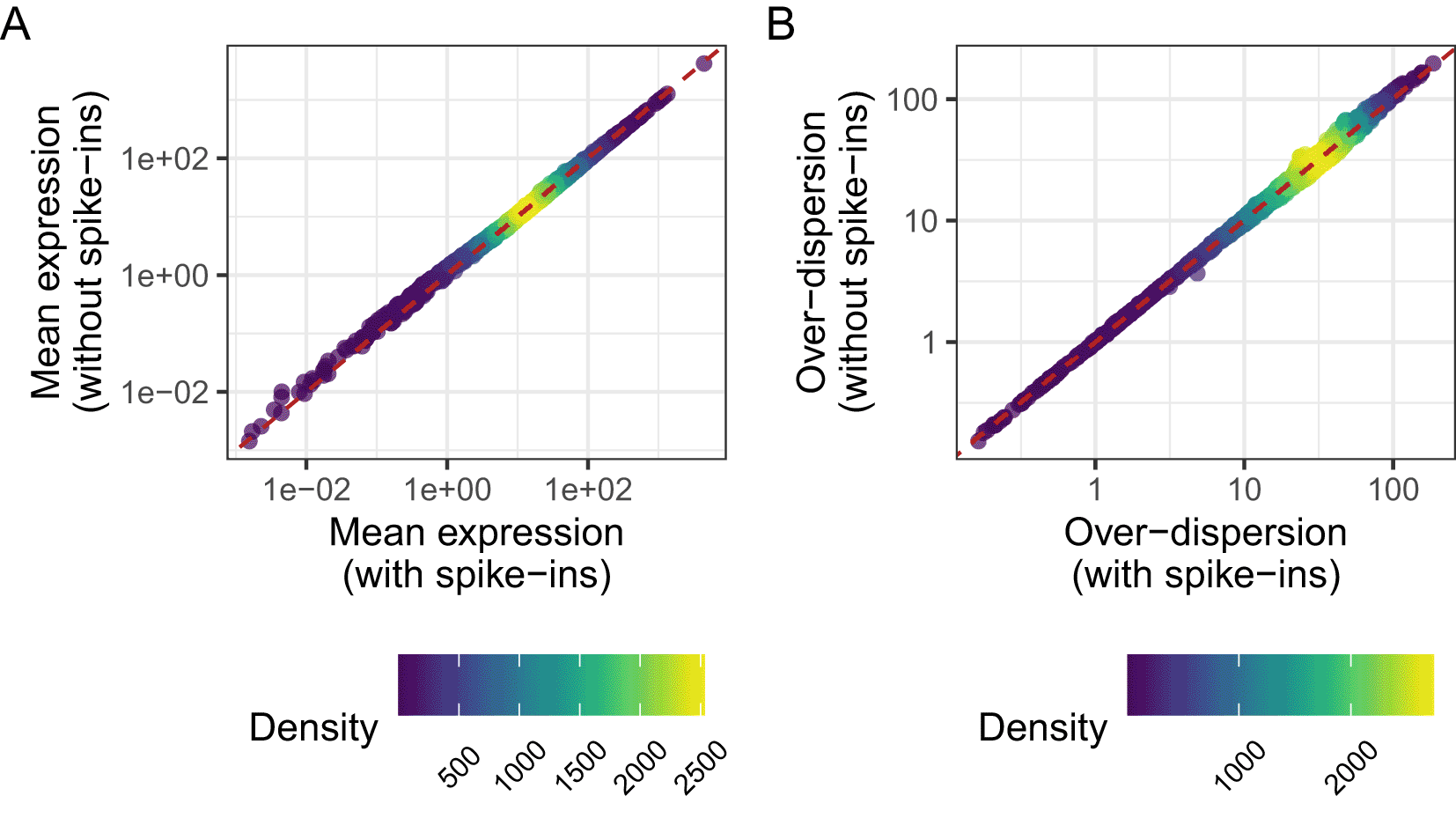 mu_spikes <- displayChainBASiCS(chain_naive) mu_nospikes <- displayChainBASiCS(chain_naive_nospikes_offset) # Remove genes with zero counts across all cells and calculate medians ind_nonzero <- rowSums(counts(sce_naive)) != 0 mu_spikes <- colMedians(mu_spikes[, ind_nonzero]) mu_nospikes <- colMedians(mu_nospikes[, ind_nonzero]) g1 <- ggplot() + aes(mu_spikes, mu_nospikes) + geom_pointdensity(alpha = 0.7) + scale_colour_viridis(name = "Density") + scale_x_log10() + scale_y_log10() + geom_abline( colour = "firebrick", linetype = "dashed", slope = 1, intercept = 0 ) + labs( x = "Mean expression\n(with spike-ins)", y = "Mean expression\n(without spike-ins)" ) + theme( legend.position = "bottom", legend.text = element_text(angle = 45, size = 8, hjust = 0.5, vjust = 0.5) ) delta_spikes <- displayChainBASiCS(chain_naive, Param = "delta") delta_nospikes <- displayChainBASiCS(chain_naive_nospikes_offset, Param = "delta") g2 <- ggplot() + aes(colMedians(delta_spikes), colMedians(delta_nospikes)) + geom_pointdensity(alpha = 0.7) + scale_colour_viridis(name = "Density") + scale_x_log10() + scale_y_log10() + geom_abline( colour = "firebrick", linetype = "dashed", slope = 1, intercept = 0 ) + labs( x = "Over-dispersion\n(with spike-ins)", y = "Over-dispersion\n(without spike-ins)" ) + theme( legend.position = "bottom", legend.text = element_text(angle = 45, size = 8, hjust = 0.5, vjust = 0.5) ) g1 + g2 + plot_annotation(tag_levels = "A")