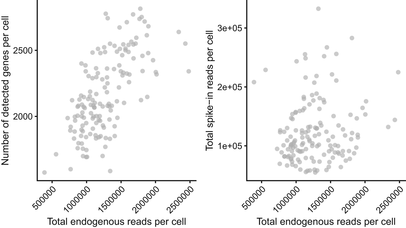 sce_naive_active <- addPerCellQC (sce_naive_active, use_altexps = TRUE) p_cell_qc1 <- plotColData( sce_naive_active, x = "sum", y = "detected") + xlab("Total endogenous reads per cell") + ylab("Number of detected genes per cell") + theme(axis.text.x = element_text(hjust = 1, angle = 45)) p_cell_qc2 <- plotColData( sce_naive_active, x = "sum", y = "altexps_spike-ins_sum") + xlab("Total endogenous reads per cell") + ylab("Total spike-in reads per cell") + theme(axis.text.x = element_text(hjust = 1, angle = 45)) library("patchwork") p_cell_qc1 + p_cell_qc2