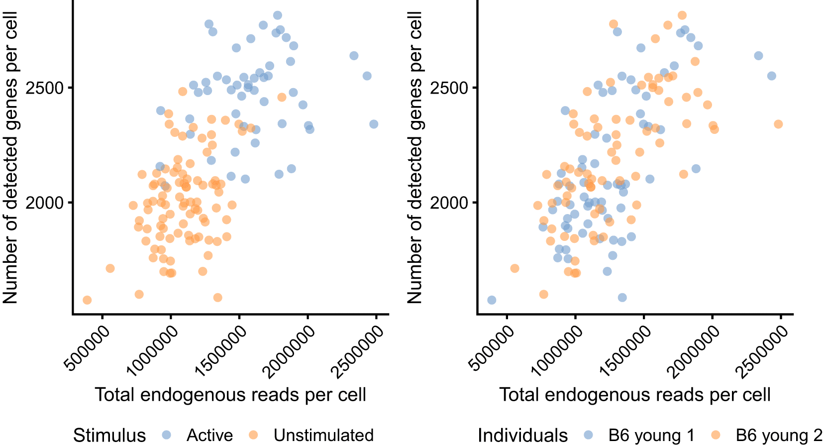 p_stimulus <- plotColData( sce_naive_active, x = "sum", y = "detected", colour_by = "Stimulus" ) + xlab("Total endogenous reads per cell") + ylab("Number of detected genes per cell") + theme( legend.position = "bottom", axis.text.x = element_text(angle = 45, hjust = 1) ) p_batch <- plotColData( sce_naive_active, x = "sum", y = "detected", colour_by = "Individuals" ) + xlab("Total endogenous reads per cell") + ylab("Number of detected genes per cell") + theme( legend.position = "bottom", axis.text.x = element_text(angle = 45, hjust = 1) ) p_stimulus + p_batch