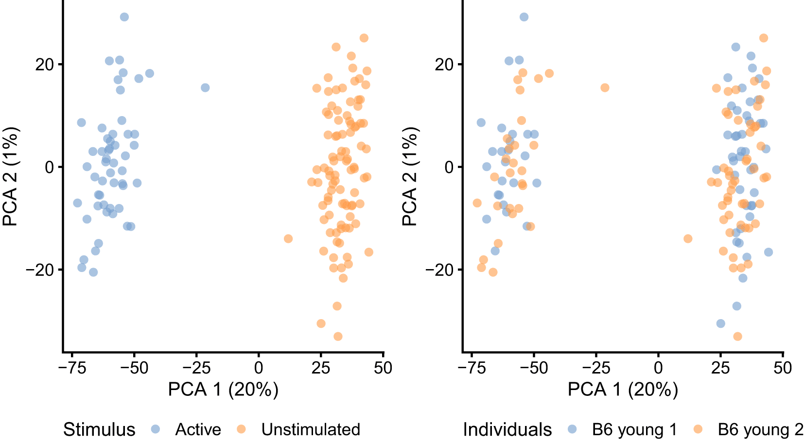## Global scaling normalisation + log tranformation + PCA sce_naive_active <- computeSumFactors(sce_naive_active) sce_naive_active <- logNormCounts(sce_naive_active) sce_naive_active <- runPCA(sce_naive_active) p_stimulus <- plotPCA(sce_naive_active, colour_by = "Stimulus") + theme(legend.position = "bottom") p_batch <- plotPCA(sce_naive_active, colour_by = "Individuals") + theme(legend.position = "bottom") p_stimulus + p_batch