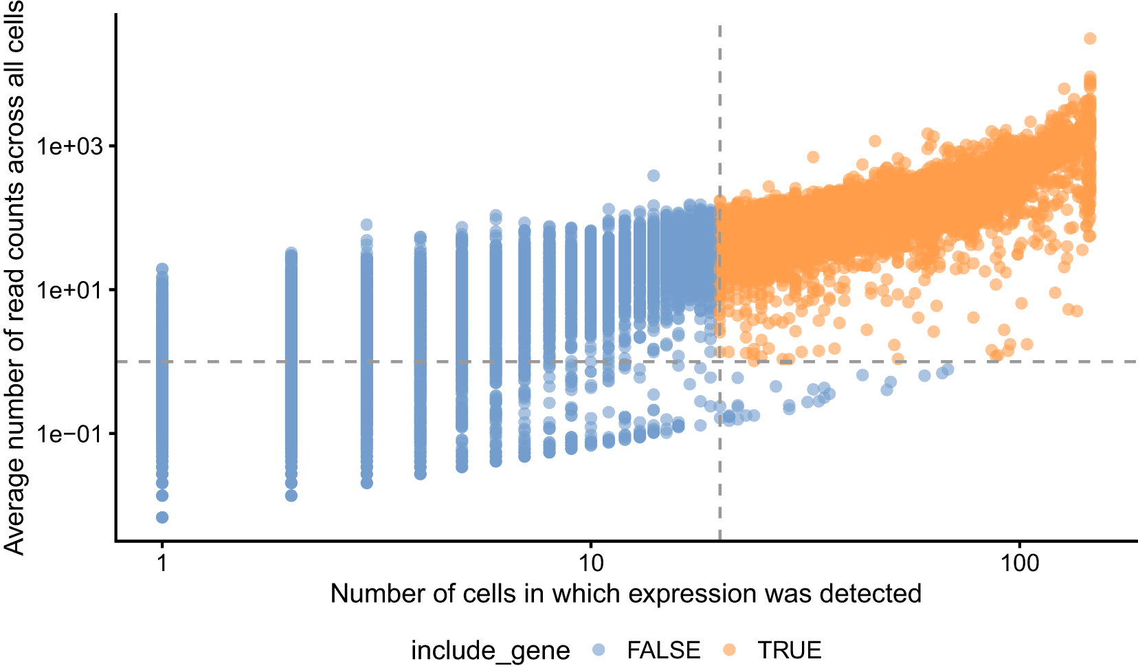 Dashed grey lines are shown at the thresholds below which genes are removed.
