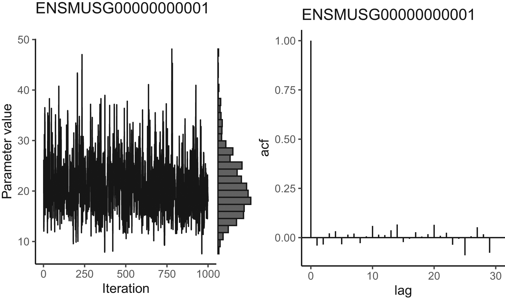 As well as assessing MCMC convergence, it is important to ensure that the MCMC algorithm has efficiently explored the parameter space. For example, the autocorrelation function (e.g. Figure 6, right panel) quantifies the correlation between the chain and its lagged versions. Strong autocorrelation indicates that neighbouring MCMC samples are highly dependent and suggest poor sampling efficiency. The latter may indicate that the MCMC draws do not contain sufficient information to produce accurate posterior estimates. In other words, highly correlated MCMC samplers require more samples to produce the same level of Monte Carlo error for an estimate (defined as the variance of a Monte Carlo estimate across repetitions51).