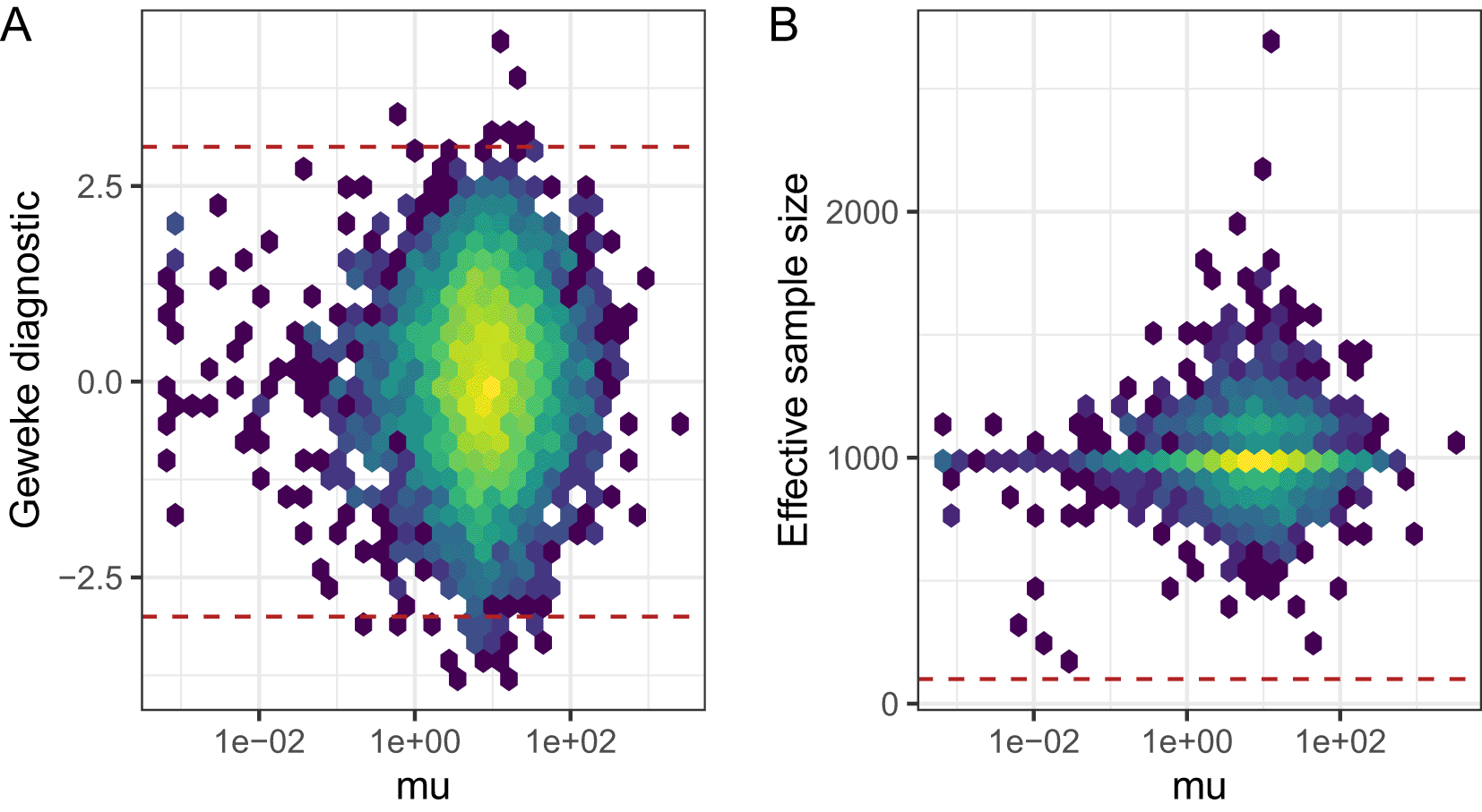 A: Geweke Z-score for mean expression parameters is plotted against mean expression estimates. Dashed lines represent absolute Z-scores of 3, outside of which we advise caution when interpreting results. B: Effective sample size (ESS) is plotted against mean expression estimates. A dashed line shows a threshold of 100, below which we advise caution when interpreting results.