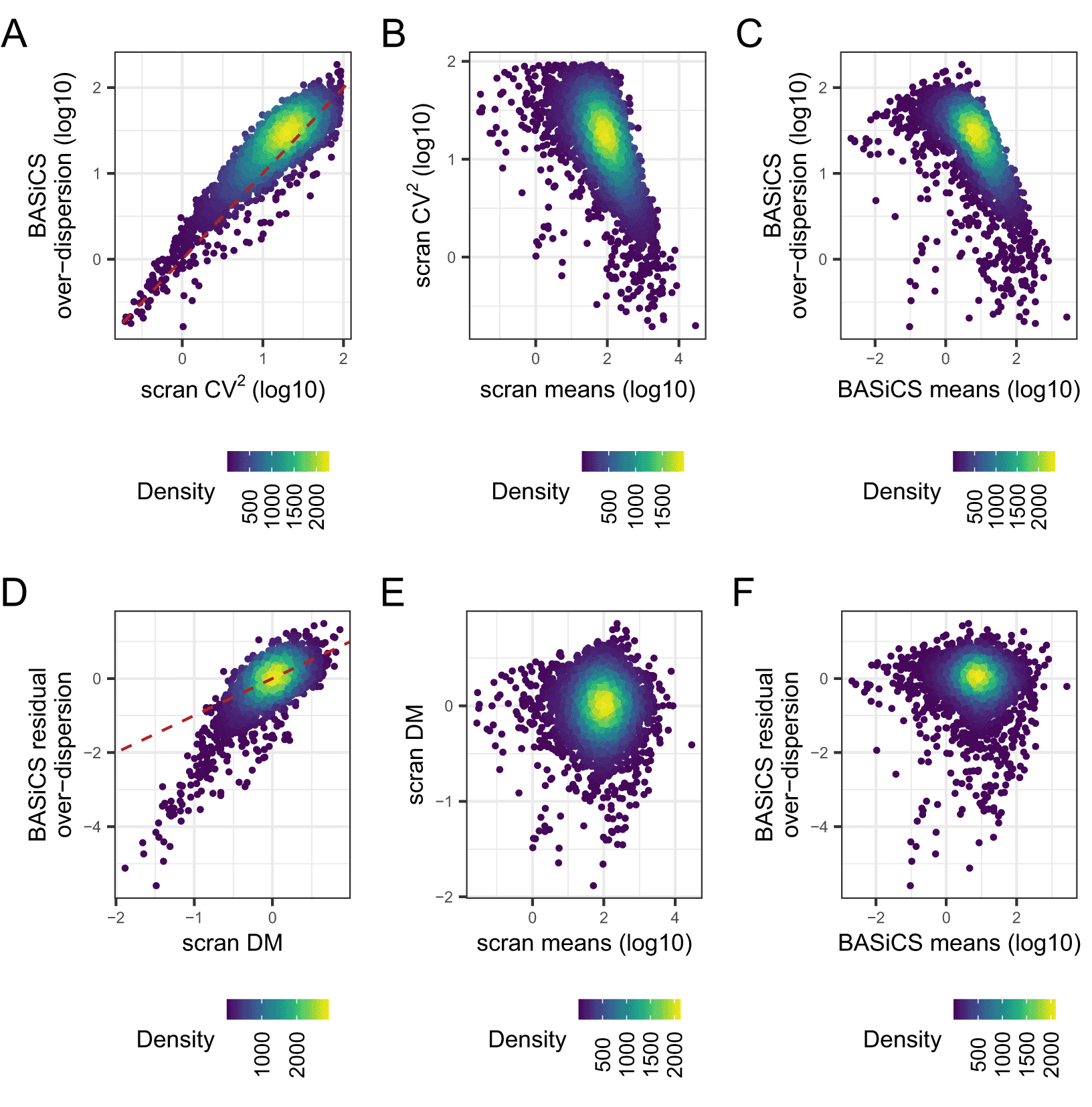 As seen in Figure 8A, CV2 and posterior estimates for are highly correlated. Moreover, both variability metrics are confounded by differences in mean expression, i.e. highly expressed genes tend to exhibit lower variability (Figure 8B–C). To remove this confounding, scran and BASiCS derive residual variability estimates as deviations with respect to an global mean-variability trend (see Methods). These are derived using the DM approach43 and the residual over-dispersion parameters defined by Ref. 29, respectively. For the naive CD4+ T cell data, both approaches led to strongly correlated estimates (Figure 8D) and, as expected, neither DM values nor posterior estimates for are seen to be associated with mean expression (Figure 8E–F). However, unlike the DM method, the integrated approach implemented in BASiCS provides a direct measure of statistical uncertainty for these estimates via posterior variance. Note that the BASiCS_ShowFit function can be used to generate Figure 8C, but we generated the plot manually to demonstrate how users can extract this information from a BASiCS_MCMC object, and for visual consistency with the other panels. For each of the panels in Figure 8, we use the R package ggpointdensity to visualise the local density of genes along the axes of mean and variability.
