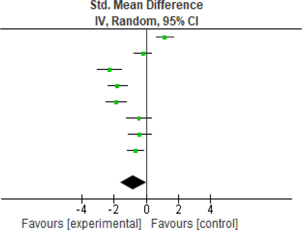 For pain, (Figure 2) eight studies were analyzed for the VAS scores, pre-and post-intervention. Heterogeneity [I2] was 92% (p < 0.05). The mean difference was -0.79 with (95% CI, -1.59 to 0.01) for the intervention versus the control group (Table 3).
