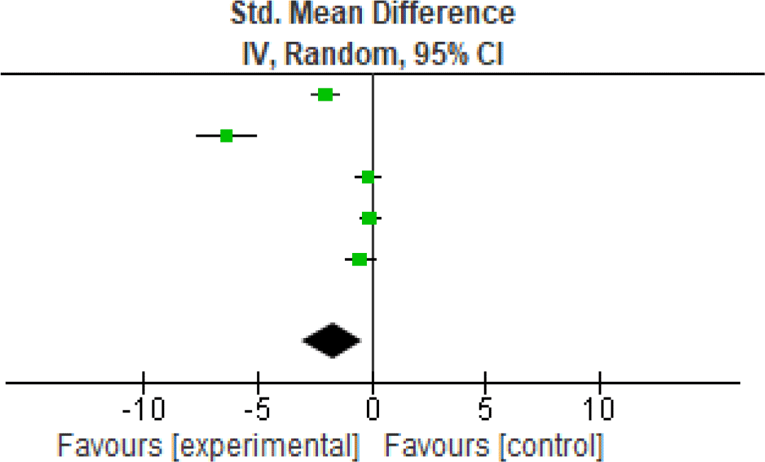 Another functional parameter was analyzed using the TUG (Figure 4) score. Five studies were analyzed and the heterogeneity [I2] was 95% (p < 0.0001). The mean difference was -1.71 (95% CI, -3.09 to -0.33) for the intervention against the control group (Table 5).