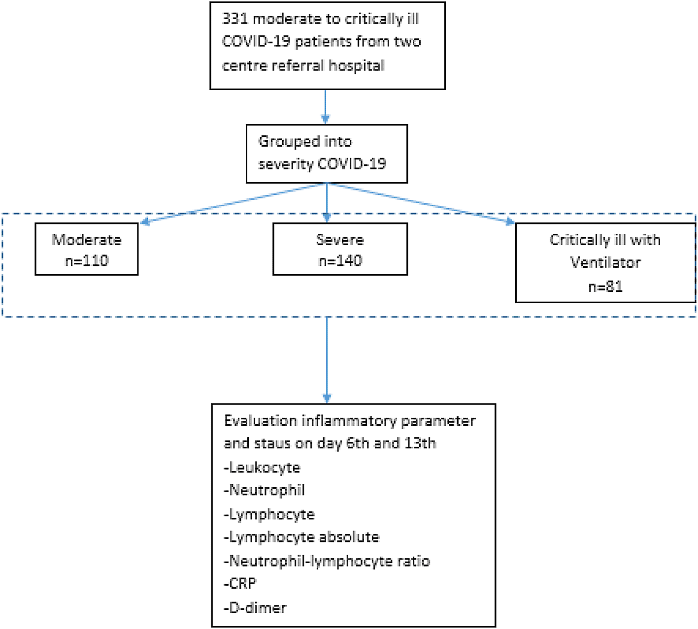 We performed a retrospective cohort study with consecutive sampling among COVID-19 adult patients admitted to two referral hospitals for COVID-19, Universitas Airlangga Hospital (UAH) and Husada Utama Hospital, Surabaya, East Java, Indonesia, from March 15th 2020 to August 31st 2020. The patients included were ones in moderate, severe, or critical condition. We assessed patients referring to WHO guidelines and Indonesian Ministry of Health guidelines, and tested for SARS-CoV-2 Polymerase Chain Reaction (PCR) through oropharyngeal and nasopharyngeal swabs. Sequential chest x-ray and laboratory inflammatory marker evaluation were performed, then we did three timeframes of assessment. The first evaluation was done at the admission, followed by a second evaluation on the sixth day, and lastly evaluated before discharge or death (mean time 13 days).