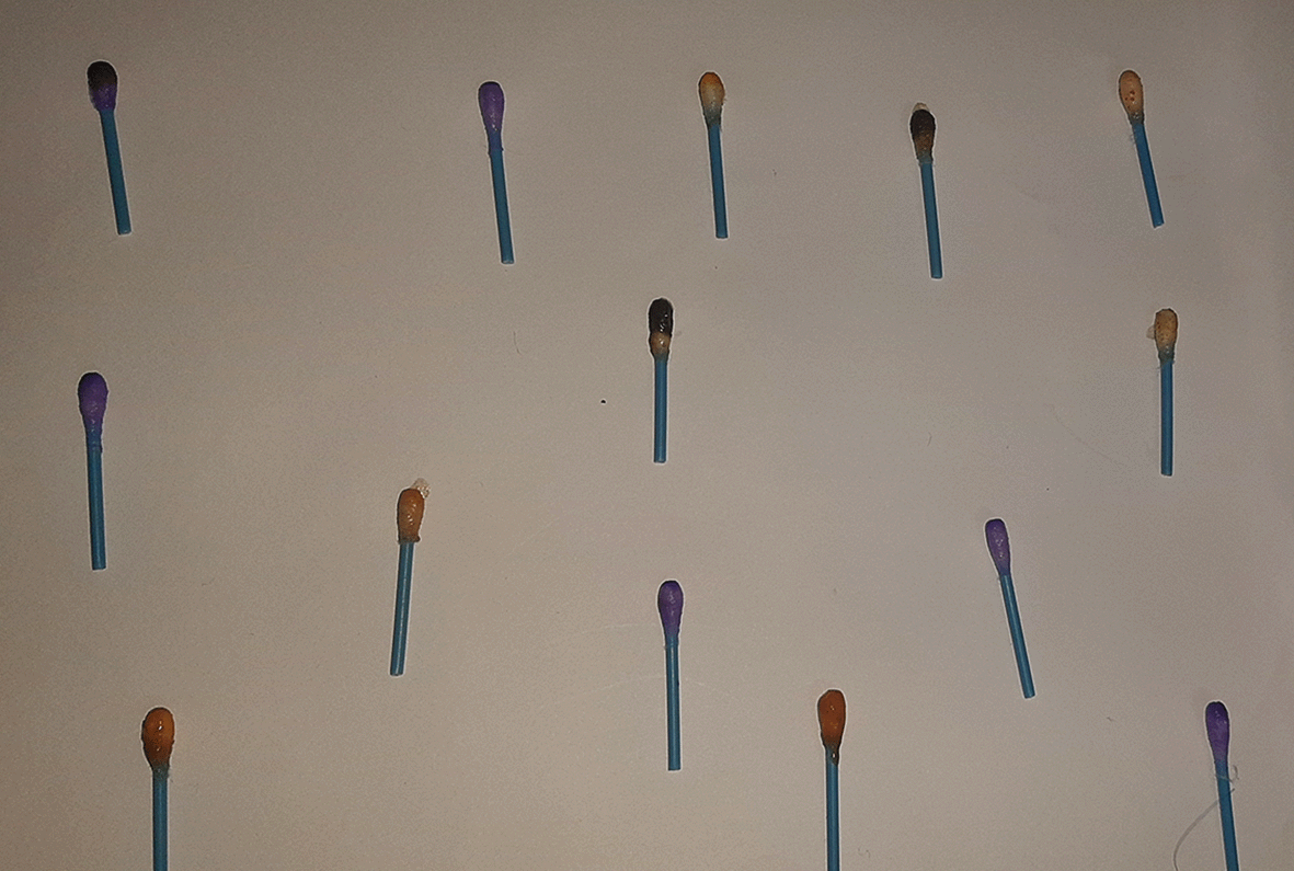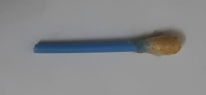 Swab test for cadmium: a clean cotton swab was dipped in 70% alcohol and dried, after which it was immersed in the extract and air-dried. The indicator was prepared in a small cup containing 1,5- diphenycarbazone and alcohol (70%) in a concentration of 70:30. The cotton swab dipped in the indicator turns violet-blue colour when confirming the presence of cadmium. The coloured complex is formed when cadmium reacts with diphenycarbazone.21