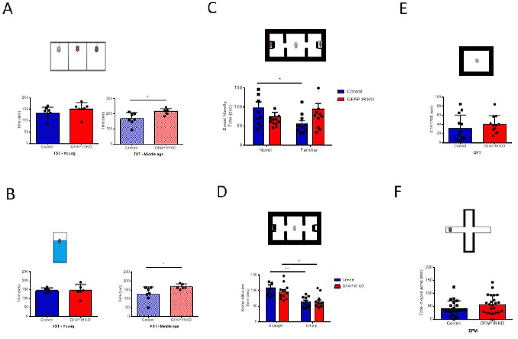 A, Adult (right histograms, control n= 6, GFAP IR KO n=7, t-test, t= 2.54; *p<0.05), but not young (left histograms, control n= 8, GFAP IR KO n=7, t-test, t= 1.26, p=0.22) GFAP IR KO mice show increased immobilization time in the tail suspension test (upper drawing), an indicator of a depressive-like behavior and reduced resilience to stress. B, Similarly, in the forced swim test (upper drawing), adult (right histograms, control n= 5, GFAP IR KO n=6, t-test, t= 2.5; *p<0.05, Welch`s correction), but not young (left histograms, control n= 5, GFAP IR KO n=6, t-test, t= 0.10; p=0.922) GFAP IR KO mice show increased depressive-like performance, with less time spent swimming. C, Social novelty, as measured by time spent with a novel partner vs a familiar one (upper drawing), was impaired in GFAP IR KO mice (control n= 10, GFAP IR KO n=12, t-test, t= 2.25; *p<0.05). D, Social affiliation, as determined by time spent with a stranger mouse vs an empty cage, was normal in GFAP IR KO mice (control n= 10, GFAP IR KO n=12, 2-way RM ANOVA, condition factor, F(1,20)=28.74; ***p<0.001, Sidak's multiple comparisons test, control familiar mice vs empty cage, ***p<0.001, GFAP IR KO novel vs familiar, **p<0.01). E, Time spent in the center of an open arena (upper drawing), a measure of novelty stress indicating levels of anxiety remained within control levels in adult GFAP IR KO mice (n=12 per group; t-test; t=0.77, p=0.445). F, Anxiety levels, as determined by time in the open arms of the elevated plus maze (upper drawing), are slightly, were normal in adult GFAP IR KO mice (control n= 21, GFAP IR KO n=24, t-test, t= 1.46, p=0.15). GFAP=glial fibrillary astrocytic protein.
