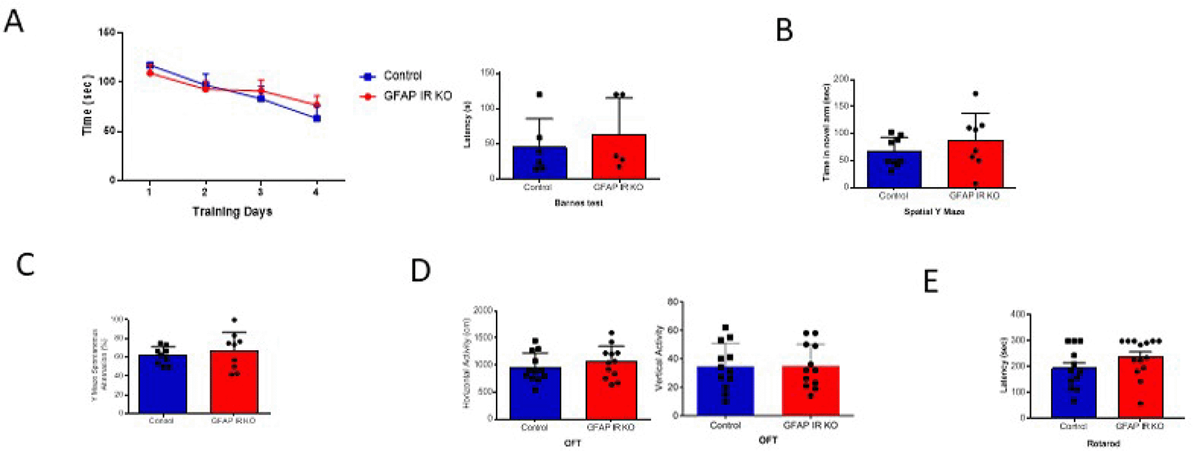 A, Adult GFAP IR KO mice performed similarly in the Barnes maze as compared to littermates, indicating intact spatial learning (n=9 per group, training days: 2-way ANOVA: F(1,36)=0.10, p=0.74; test day: t-test, Welch’s correction, t=0.65, p=0.53). B, Time spent in the novel arm of the spatial Y maze was similar to littermates in GFAP IR KO mice (n=9 per group, t-test, t=1.24, p=0.23). C, Number of spontaneous alternations in the arms of the Spontaneous Alternation Y maze, a measure was similarly unaltered in adult GFAP IR KO mice (n=9 per group, t-test, Welch’s correction, t= 0.67, p=0.51). D, No differences were observed in horizontal (left histograms) and vertical (right) activity in the open field arena was observed between experimental groups (n=12 per group, H: t-test, t=0.84, p=0.40; V: t-test, t= 0.05, p=0.95). E, Control littermates and GFAP IR KO mice show similar levels of motor coordination, as assessed in the rota-rod (control n=12, GFAP IR KO n=14, H: t-test, t=1.52, p=0.14). IR=insulin receptors, GFAP=glial fibrillary astrocytic protein.