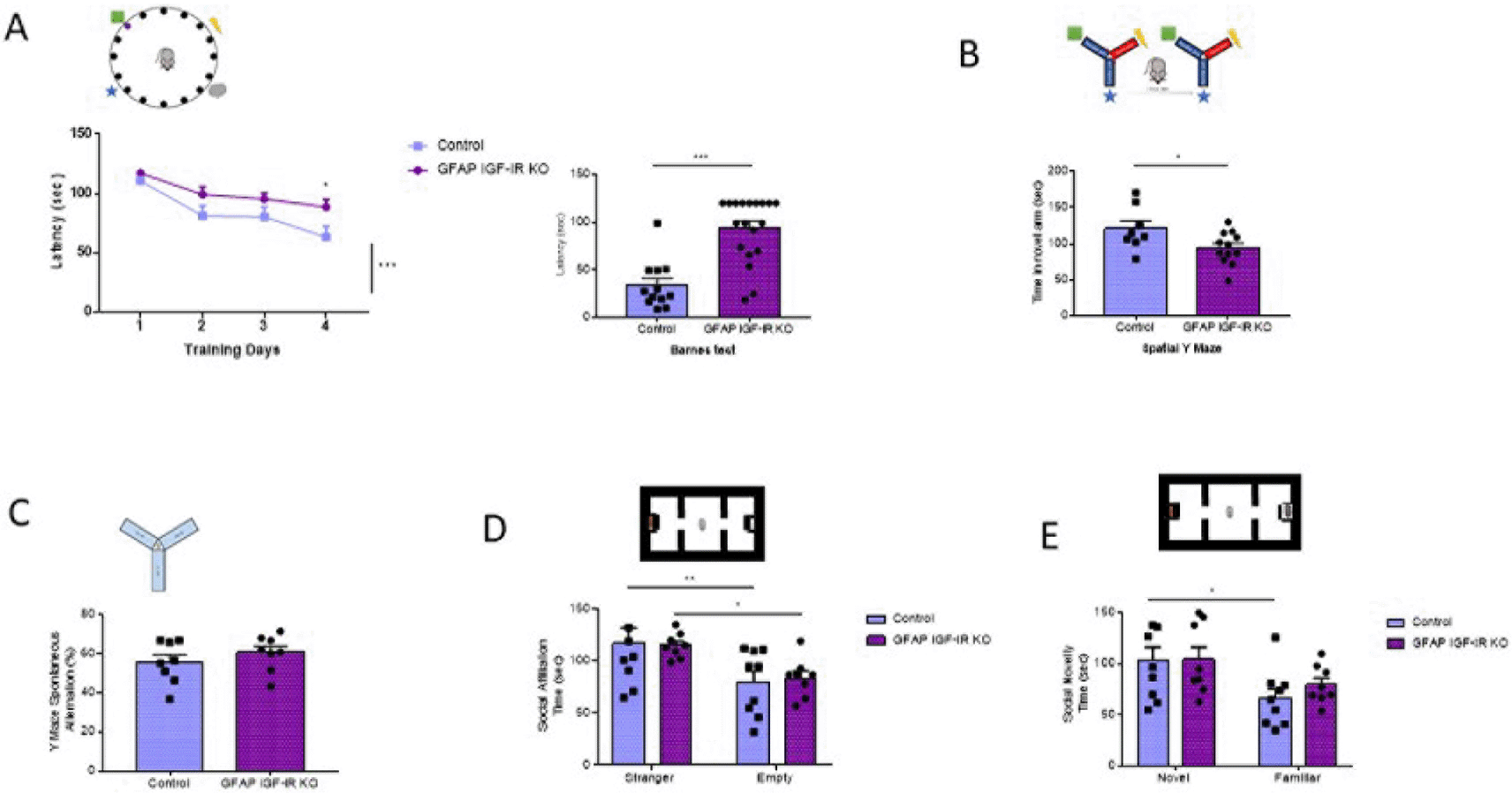 A, Spatial learning in the Barnes maze (upper drawing) was markedly affected in GFAP IGF-IR KO mice, showing significantly reduced memory (control n= 12, GFAP IR KO n=19, training days: 2-way ANOVA, time factor, F(3,122)=12.7; ***p<0.001, Sidak's multiple comparisons test, control vs GFAP 4th day of training, *p<0.05; test day: Mann-Whitney U: 21.5, ***p<0.001). B, Time spent in the novel arm of the Y maze (upper drawing), a measure of spatial memory, was reduced in GFAP IGF-IR KO mice (control n= 8, GFAP IGF-IR KO n=12, t-test, t= 2.26, *p<0.05). C, Number of spontaneous alternations in a Y maze, a measure of working memory (upper drawing), was similarly unaltered in adult GFAP IGF-IR KO mice (n=8 per group; t-test; t=0.98, p=0.342). D, Social affiliation, as determined by time spent with a stranger mouse vs an empty cage (upper drawing), was normal in GFAP IGF-IR KO mice (control n=9, GFAP IGF-IR KO n=8, 2-way RM ANOVA, condition factor, F(1,15)=19.13; ***p<0.001, Sidak's multiple comparisons test, control familiar mice vs empty cage, **p<0.01, GFAP IR KO familiar vs empty cage, *p<0.05). E, Social novelty, as measured by time spent with a novel partner (upper drawing), was impaired in GFAP IGF-IR KO mice (control n=9, GFAP IGF-IR KO n=8, 2-way RM ANOVA, condition factor, F(1,15)=11.18; **p<0.01, Sidak's multiple comparisons test, control novel mice vs familiar mice, *p<0.05, GFAP IGF-IR KO novel mice vs familiar mice, p=0.16). GFAP=glial fibrillary astrocytic protein.