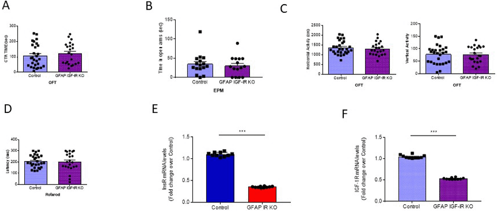A, No differences in time spent in the center of an open field were observed between littermates and mutant GFAP IGF-IR KO mice (control n=28, GFAP IGF-IR KO n=22, t-test, t=0.73, p=0.46). B, No differences were observed in anxiety levels determined in the EPM between GFAP-IGF-IR KO and littermates (control n=16, GFAP IGF-IR KO n=15, t-test, t=0.48, p=0.63). C, No differences were observed in horizontal (left histograms) and vertical (right) activity in the open field arena was observed between GFAP IGF-IR KO mice and littermates (control n=28, GFAP IR KO n=22, H: t-test, t=0.61, p=0.54; V: t-test, t=0.12, p=0.90). D, Control and GFAP-IGF-IR KO mice show similar levels of motor coordination, as assessed in the rota-rod (control n=22, GFAP IR KO n=27, t-test, t=0.22, p=0.82).