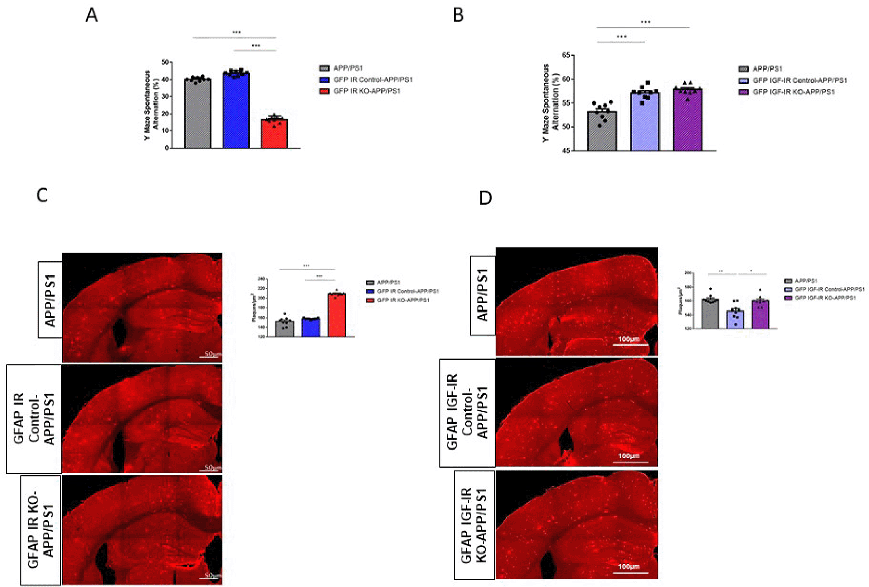 A, Performance in the working memory version of the Y maze was impaired in GFAP IR KO APP/PS1 mice (n=8 per group; One-way ANOVA, F=73.23; ***p<0.001; Tukey’s Multiple comparison test, APP/PS1 vs. GFP IR KO-APP/PS1: ***p<0.001, GFP IR Control-APP/PS1 vs. GFP IR KO-APP/PS1: ***p<0.001). B, Working memory determined in the Y maze remained unaltered in GFAP IGF-IR KO APP/PS1 mice and controls (n=8 per group; One-way ANOVA, F=2.9; p=0.07). C, Amyloid plaques in the parietal cortex and hippocampus in GFAP IR KO/APP-PS1 mice and controls. Representative photomicrographs showing amyloid plaques (red). Histograms show number of plaques/μm2 in three experimental groups (n=8 per group; One-way ANOVA, F=25.78; ***p<0.001; Tukey’s Multiple comparison test, APP/PS1 vs. GFP IR KO-APP/PS1: ***p<0.01, GFP IR Control-APP/PS1 vs. GFP IR KO-APP/PS1: ***p<0.001). D, Amyloid plaques in the parietal cortex and hippocampus in GFAP IGF-IR KO/APP-PS1 mice and controls does not show differences between groups. Representative photomicrographs showing amyloid plaques (red). Histograms show number of plaques/μm2 in the three experimental groups (n=8 per group; One-way ANOVA, F=1.35; p=0.32). IR=insulin receptors, GFAP=glial fibrillary astrocytic protein.