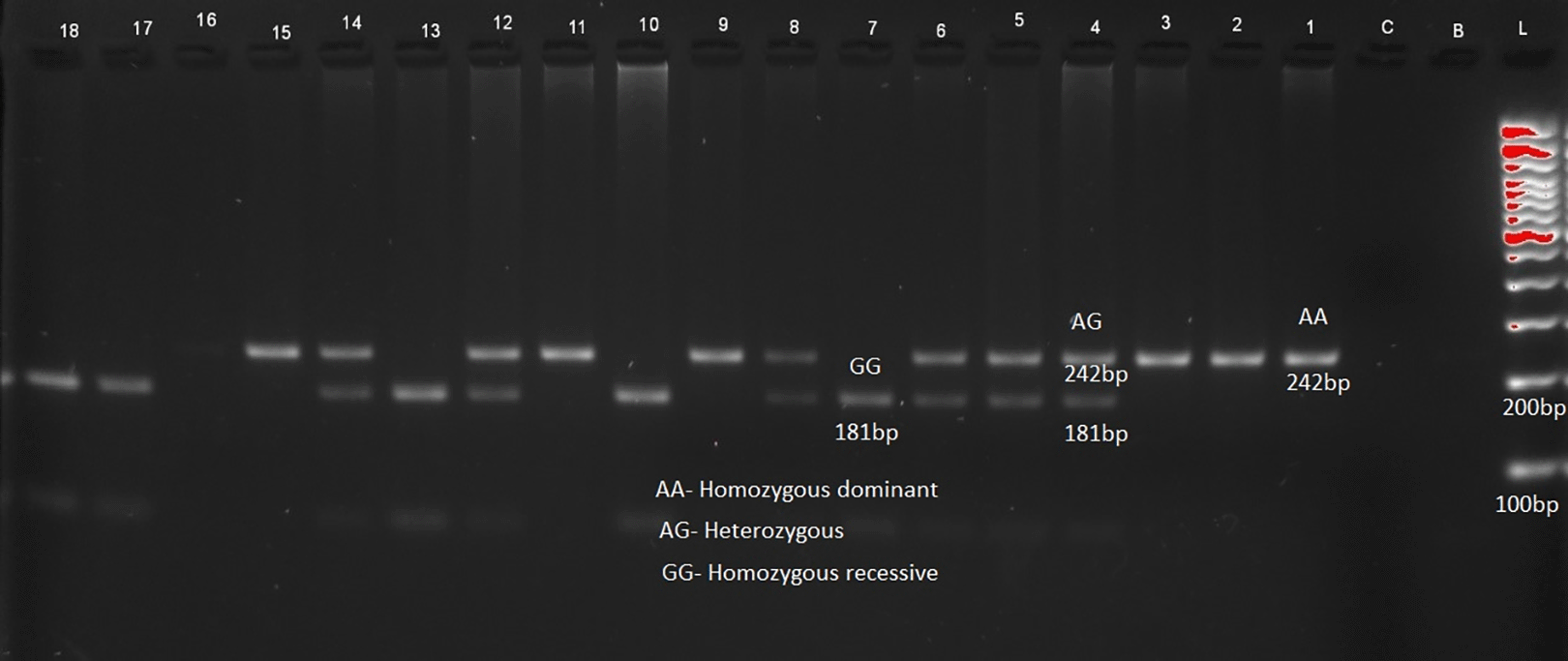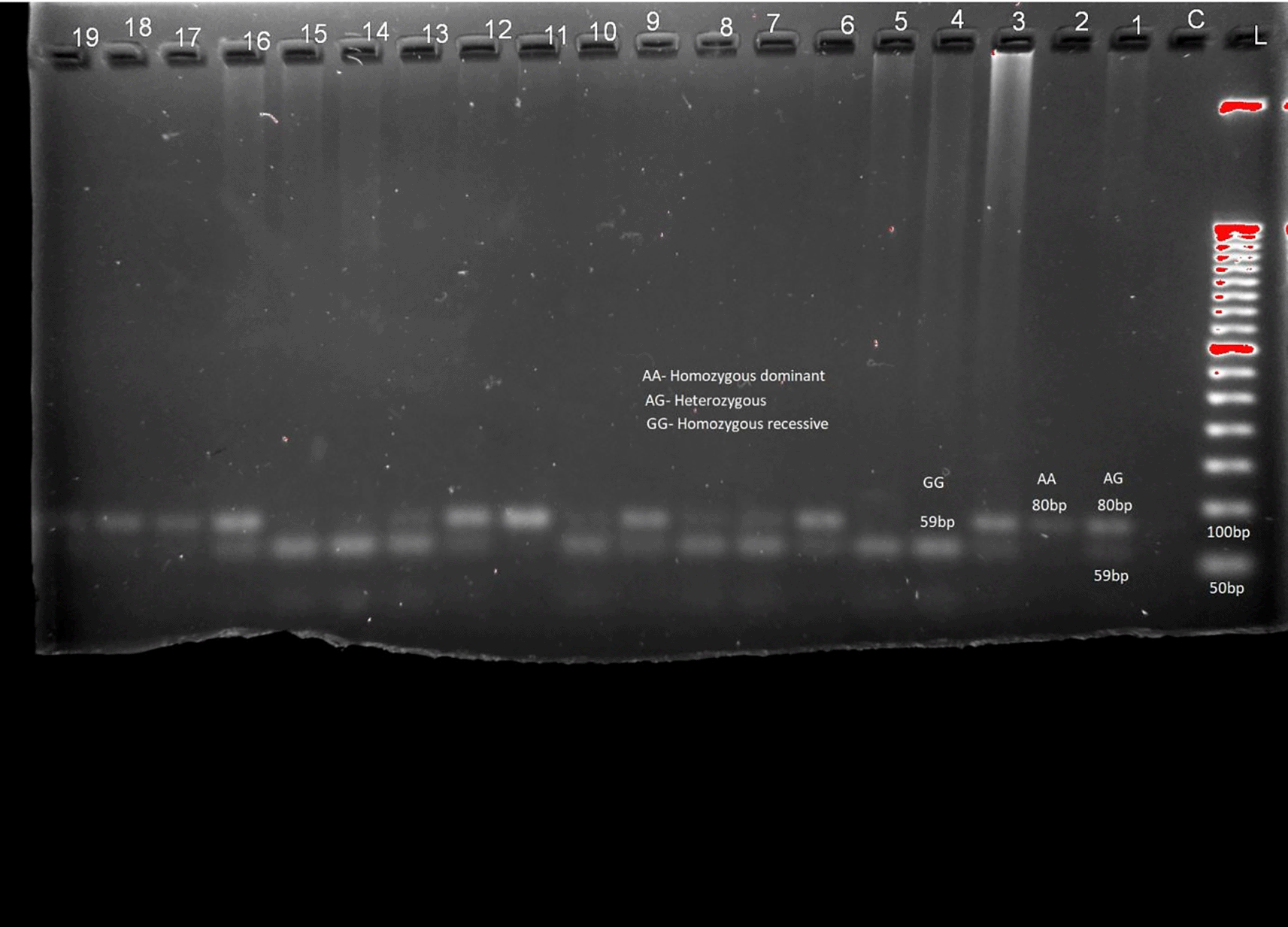 For DNA extraction from leucocytes, a DNA extraction mini kit (Thermofishers scientific, catalogue number: K182001) was employed, and the purity of the extracted DNA was verified using electrophoresis. For electrophoresis, a 0.8%Agarose gel with 0.5 g/ml ethidium bromide in TAE buffer was utilised. The purity of the DNA was determined using a spectrophotometer (OD260/OD280 ratio).