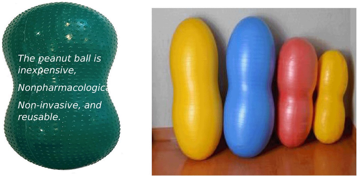 The peanut ball is an alternative to the conventional birth ball. The birthing ball is preferably used during the pregnancy period (Ghasab, Kohan, Firoozehchian, & Ebrahimi, 2019; Mirzakhani, Hejazinia, Golmakani, Sardar, & SHakeri, 2015), whereas the effectiveness of the peanut ball is elicited even during labour (Outland & Alvarado, 2019). The peanut ball is a curved peanut-shaped ball that has a middle indentation that allows the women to place the ball between and below the knees for allowing either the lateral, supine or sitting position, which increases pelvic dimensions, promotes progressive fetal rotation and descent during second-stage labour and ultimately promote the progress of labour (Zwelling, 2010; Roth, Dent, Parfitt, Hering, & Bay, 2016). Several studies have shown a reduction in either the length of labour (Roth, Dent, Parfitt, Hering, & Bay, 2016; Tussey CM, 2015 Jan) or a reduction in the cesarean birth (Outland & Alvarado, 2019) with use of the peanut ball in immobile women.