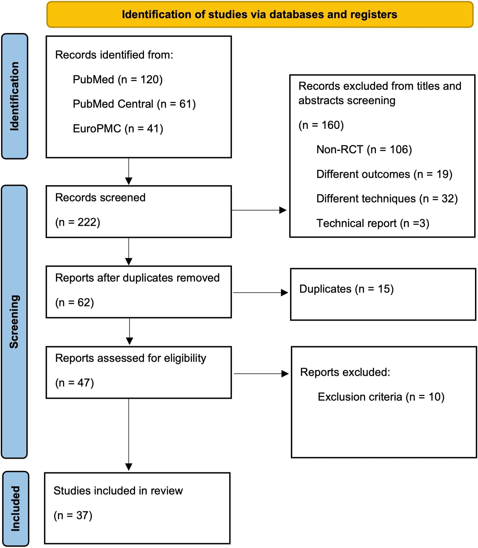 The initial search generated 222 records, in which 37 RCTs were included for qualitative synthesis (systematic review) following the screening, removing duplication, and excluding of several studies (Figure 1).14–50 These final included RCTs yielded 2,129 and 2,392 patients who underwent SILC and CMLC. All patients had uncomplicated gall bladder diseases with ASA grade I-III and were eligible to undergo both techniques. The types of surgical ports ranged from conventional instruments to specific models. Three studies were double-blind RCTs, one was a single-blind RCT, and the remaining RCTs did not elaborate on the blinding method. A total of 10 studies were excluded due to including BMI >35 kg/m2, age <18 years old, and retrospective study.51–60 The full details of data characteristics are available in Table 1.