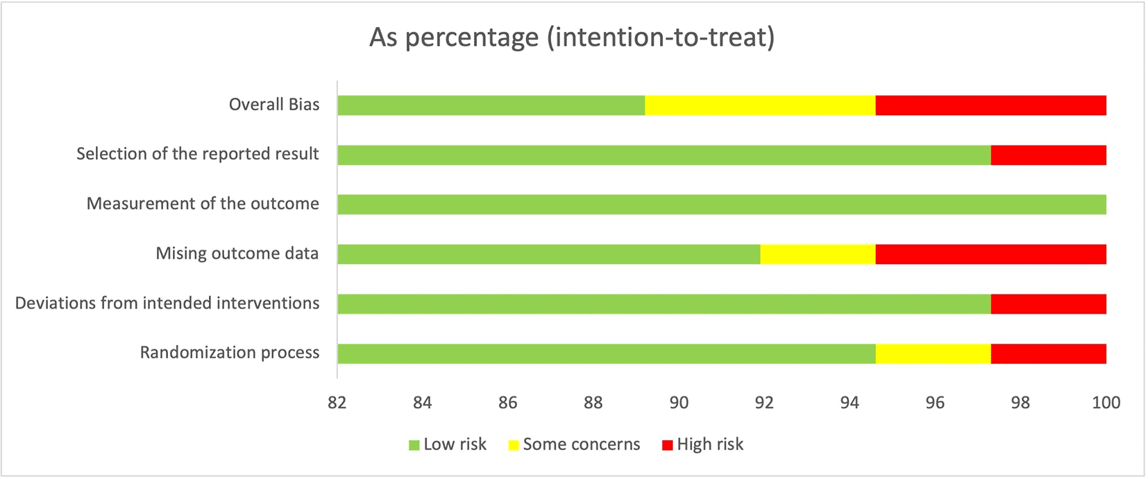 Two authors (RR and RVH) assessed the quality of each study involved in this review independently. The Cochrane Risk of Bias (RoB) 2.0 tool was used to evaluate the quality of clinical trial studies. This tool is comprised of five domains, including (1) bias arising from the randomization process; (2) bias due to deviations from intended interventions; (3) bias due to missing outcome data; (4) bias in measurement of the outcome; and (5) bias in the selection of the reported results. The final judgments of each domain were categorized as low risk, some concerns, or high risk. The summarized five domains of RoB were concluded by RR and RVH, whereas a discussion with AW resolved any discrepancies in the judgments to reach the final consensus.