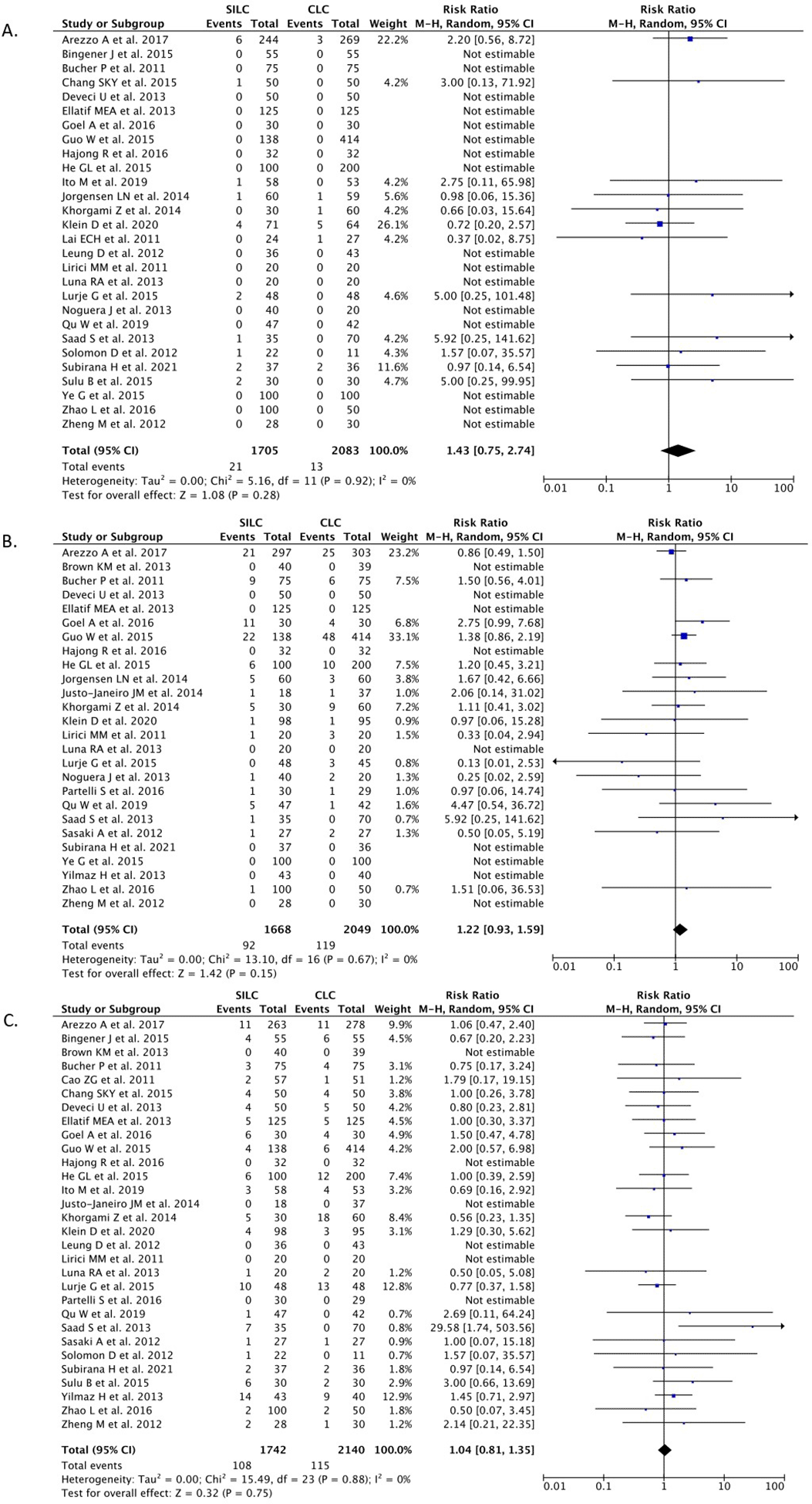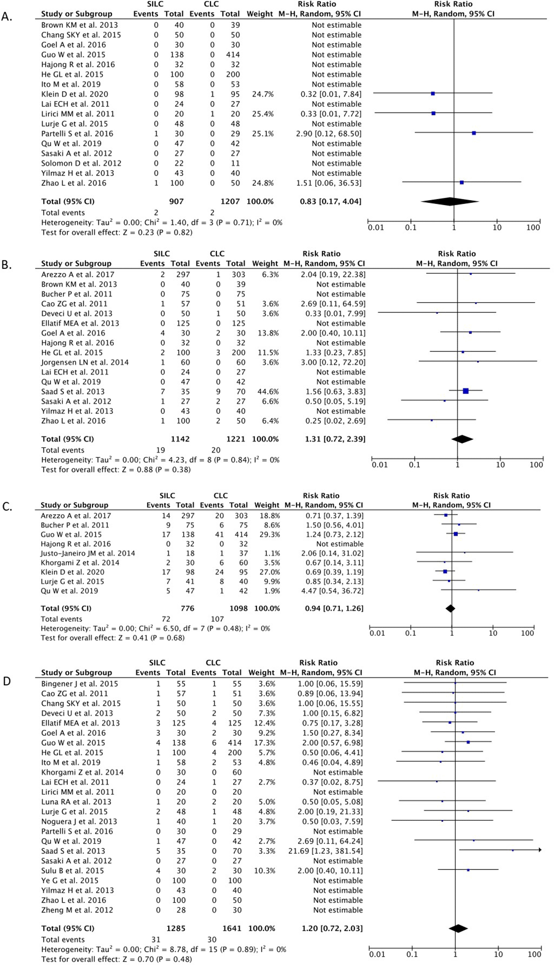 A total of 17 studies (n=2,114) reported the BDI outcome. Our pooled analysis showed that the SILC procedure did not differ from the CMLC procedure in terms of risk for BDI [RR 0.83 (95% CI 0.17–4.04), p=0.82, I2=0%, random-effect modeling] (Figure 3A).