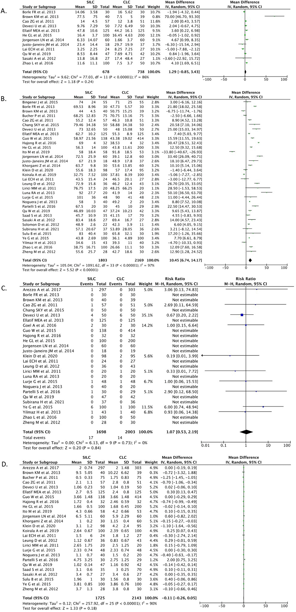 A total of 12 studies (n=1,416) reported on the estimated blood loss outcome. Our pooled analysis showed that the SILC procedure did not differ from the CMLC procedure in terms of estimated blood loss volume [MD 1.29 (95% CI -0.85, 3.43), p=0.24, I2=86%, random-effect modelling] (Figure 5A).