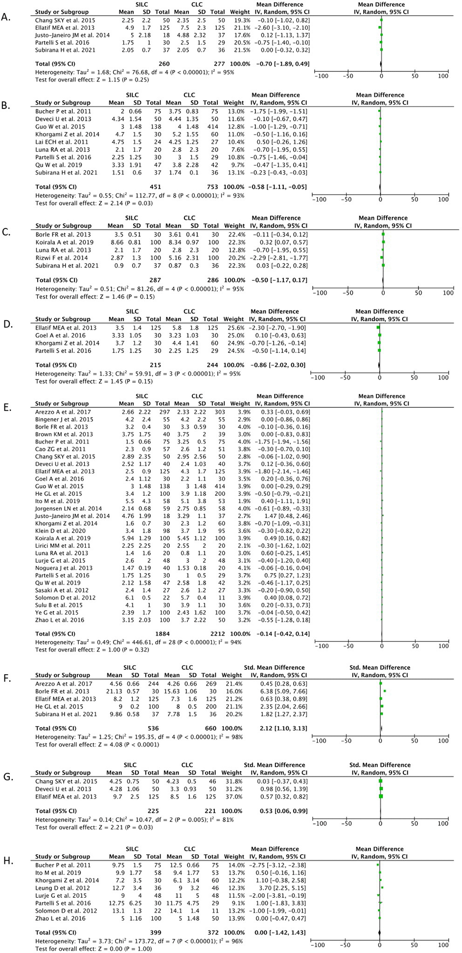 A total of 26 studies (n=3,868) reported on the length of hospital stay outcome. Our pooled analysis showed that the SILC procedure did not differ from the CMLC procedure in terms of length of hospital stay [MD -0.11 (95% CI -0.26, 0.05), p=0.18, I2=90%, random-effect modelling] (Figure 5D).