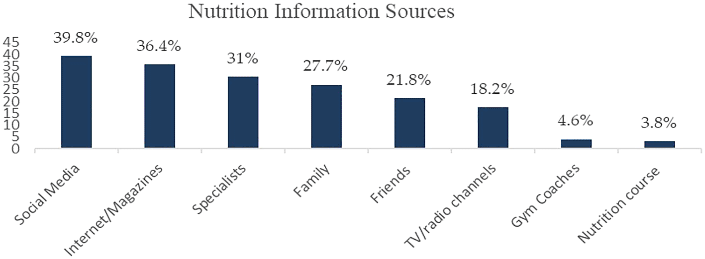 Nutrition information may be accessed from varied sources, and therefore, we asked our participants to report their frequently used sources to obtain nutrition-related information. Our findings showed that social media platforms were used more frequently (39.8%) (Figure 1). Almost 36.4% of Lebanese shoppers relied on Internet and magazines as data sources, based on our survey (Figure 1). On the other hand, a salient proportion of our sampled population (31%) accessed accurate nutrition facts from specialists, such as physicians and dietitians (Figure 1). Family (27.7%), friends (21.8%), and TV/radio channels (18.2%) were also substantial information sources. Otherwise, the minority reported referring to gym coaches (4.6%) or taking nutrition courses (3.8%) (Figure 1).