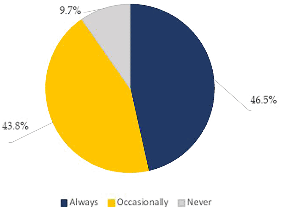 In practice, the top three information searched for when looking at the nutrition facts panel were: expiry date (75.2%), price (60.6%), and brand name (50.8%) (Table 5). Whereas the least sought for information was: nutrition and health claims (24.8%), nutrition content (24.3%), food weight (13.6%), and presence of preparation and cooking instructions (9.4%) (Table 5). Practice scores were based on 16 questions, including the frequency of checking nutrition labels, the act of comparing the nutrient content of food products, and looking at calories, macronutrients, and micronutrients on the food label. As for the frequency of checking the food label, about half of our sample population (46.5%) reported to “always” read the food label, whereas 43.8% of the respondents reported reading them occasionally and only 9.7% admitted not to read it at all (Figure 2, Table 3). Besides this, when hesitating between two food products, the majority (64.7%) reported that they don’t refer to the NFP to base their choices (Table 3).