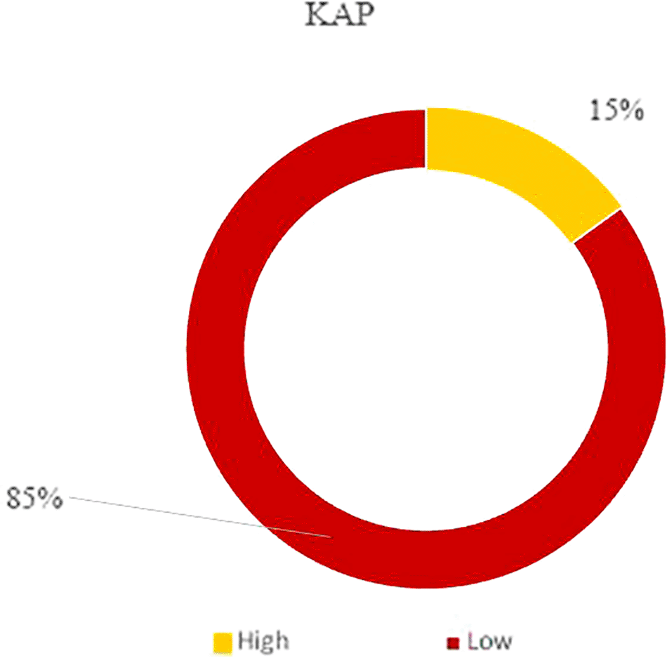 The KAP score was categorized into two levels: a low KAP (<23) and a high KAP (≥23). The descriptive analysis revealed that 15% of our overall study population had high KAP scores, and 85% scored low for KAP (Figure 3). Based on these findings, we determined the risk factors contributing to having either a low or a high score by running a binary logistic regression test.
