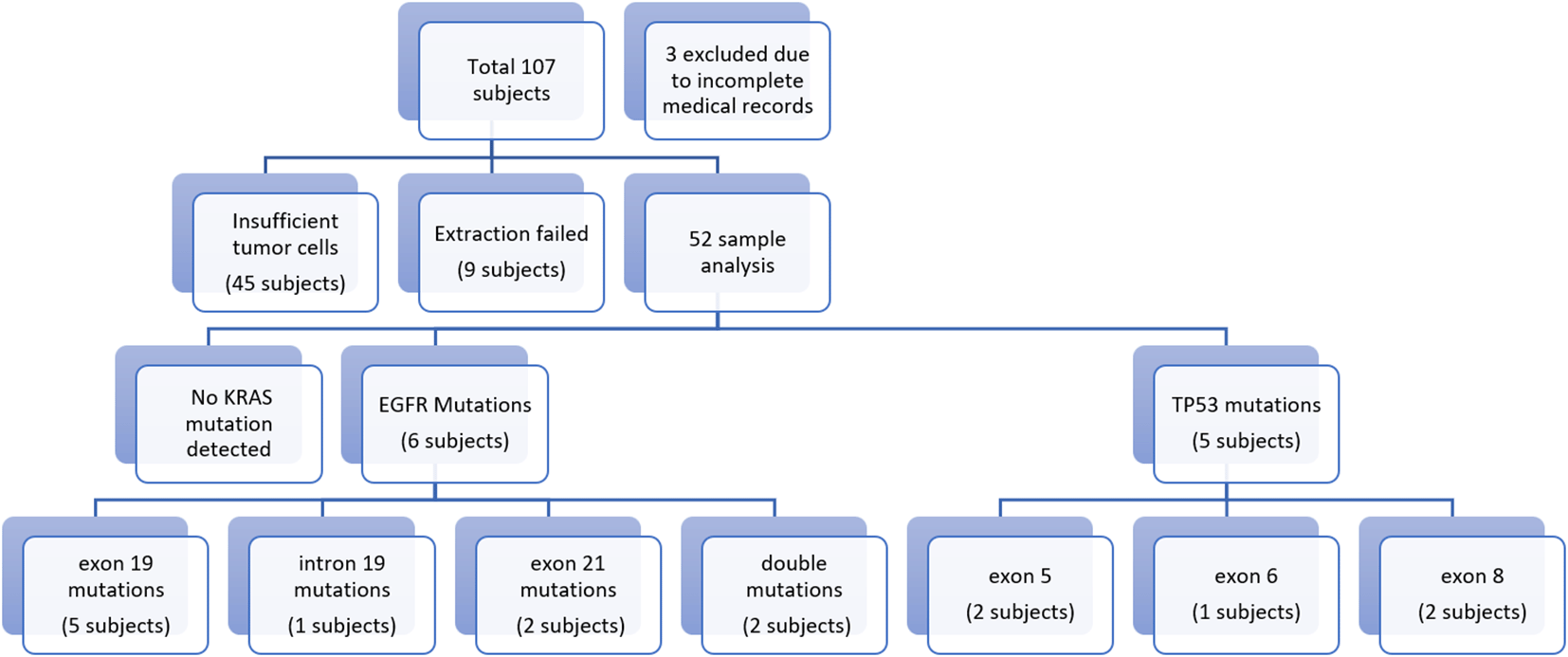 As shown in Figure 1, a total of 52 subjects completed the procedures of this study with most of the subjects being male (75%), aged over 60 years (53.8%), heavy smokers (75%), with adenocarcinoma type lung cancer (69.2%) stage IVA (71.25%). Further characteristics were as described in Table 2. From sequencing analysis results no KRAS exon 2 mutations were detected, while EGFR mutations were detected in 6 subjects, consisting of 5 subjects who had exon 19 mutations, 1 subject with intron 19 mutations, and 2 subjects with exon 21 mutations. TP53 mutations were seen in 5 subjects, of which 2 subjects had missense mutations of exon 5, 1 subject showed silent mutations, 1 subject with missense exon 8mutations, and 1 subject had nonsense exon 8 mutations.