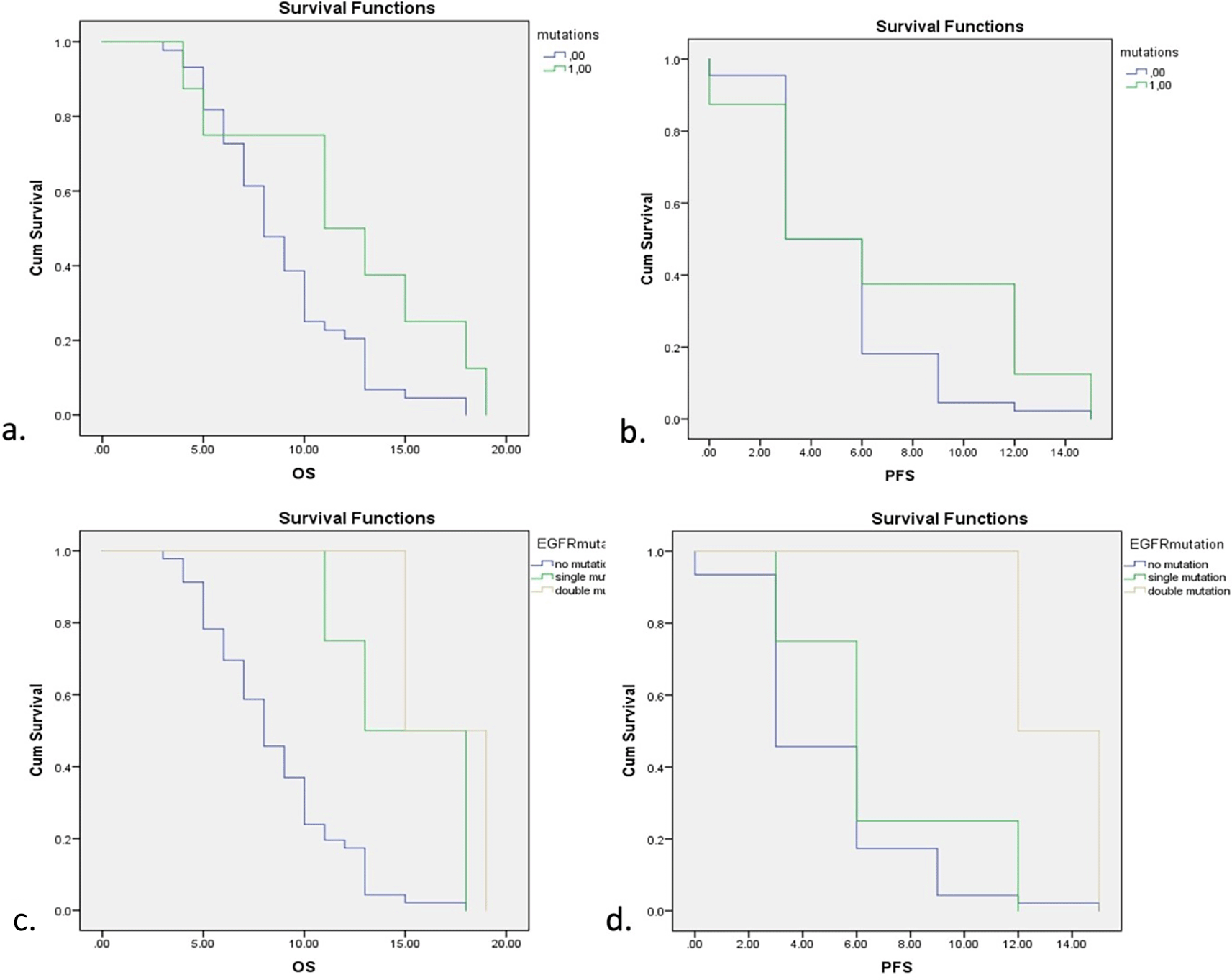 a. Overall Survival (OS) with and without EGFR mutations. b. Progression-free Survival (PFS) with and without EGFR mutations. c. OS with different types of EGFR mutations. d. PFS with different types of EGFR mutations.
