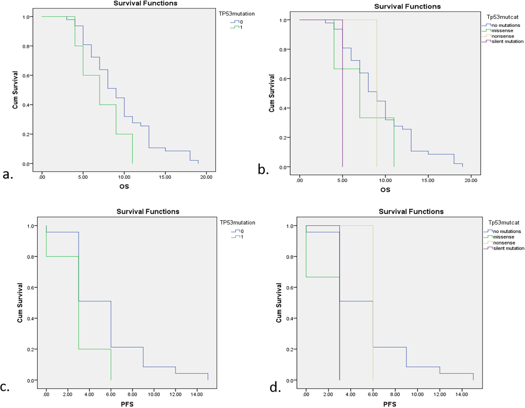 a. OS between subjects with and without TP53 mutations. b. OS with different types of TP53 mutation. c. PFS between subjects with and without TP53 mutations. d. PFS with different types of TP53 mutation.