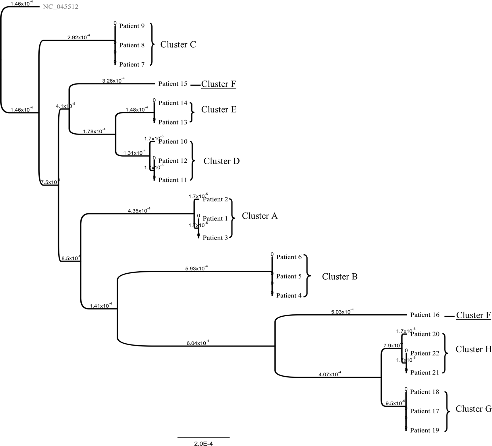 This study included 22 patients from eight family clusters, performed from January 2021 to August 2021. The patient characteristics are shown in Table 1. The phylogenetic tree is shown in Figure 1.