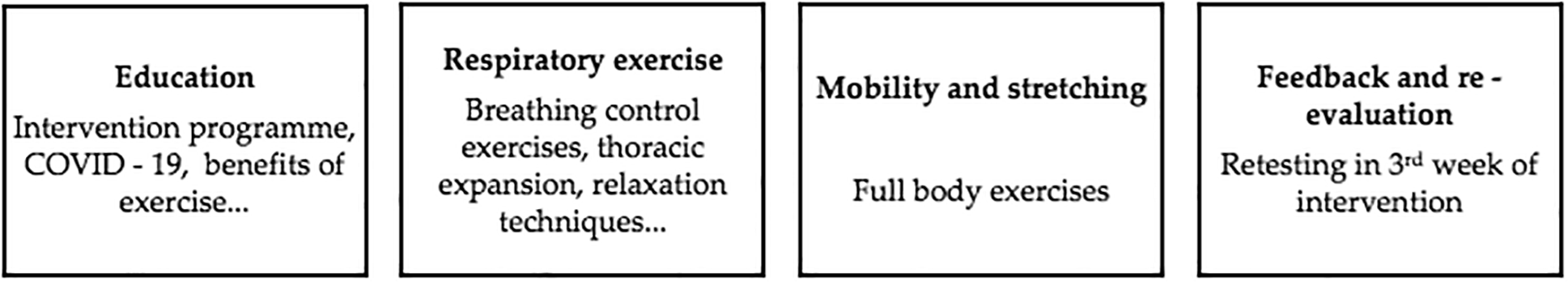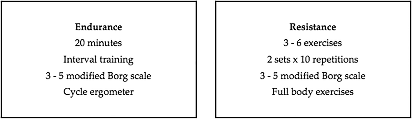 The multicomponent rehabilitation program will be carried out in six weeks of intervention with two weekly face-to-face sessions that will include endurance and resistance exercises (Figure 1) for both groups (case and control). A once a week telemedicine session will be carried out with the case group only before the face-to-face sessions, consisting of education, respiratory exercise, mobility and stretching, giving them a place to provide feedback and re-evaluate patients mid-treatment (Figure 2) and will be aimed at assessing improvement and improving therapeutic adherence. The same protocol will be performed once a week in the control group prior to the face-to-face sessions so that comparisons can be made between the two groups. This protocol will be characterized by being progressive and individualized by monitoring the load with validated tools such as the modified Borg scale and Karvonen’s formula.24,25