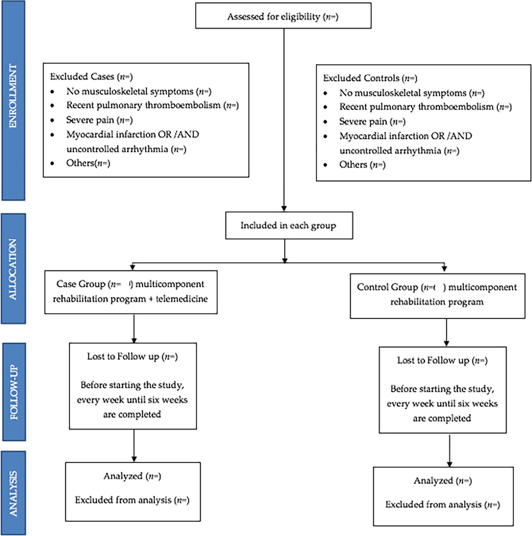 A case-control study will be carried out between June 2022 and February 2023 with male and female patients impacted by post-COVID-19 musculoskeletal symptoms who will undergo a multicomponent rehabilitation program, together with an intervention and a follow-up using programmed telemedicine sessions. Procedures will be conducted following the Strengthening the Reporting of Observational Studies in Epidemiology (STROBE) statement and checklist.23 The study protocol has been approved by the Ethical Committee of the European University of Madrid (reference number CIPI/21/046). Written informed consent will be obtained from all participants and all procedures were conducted according to the Declaration of Helsinki.