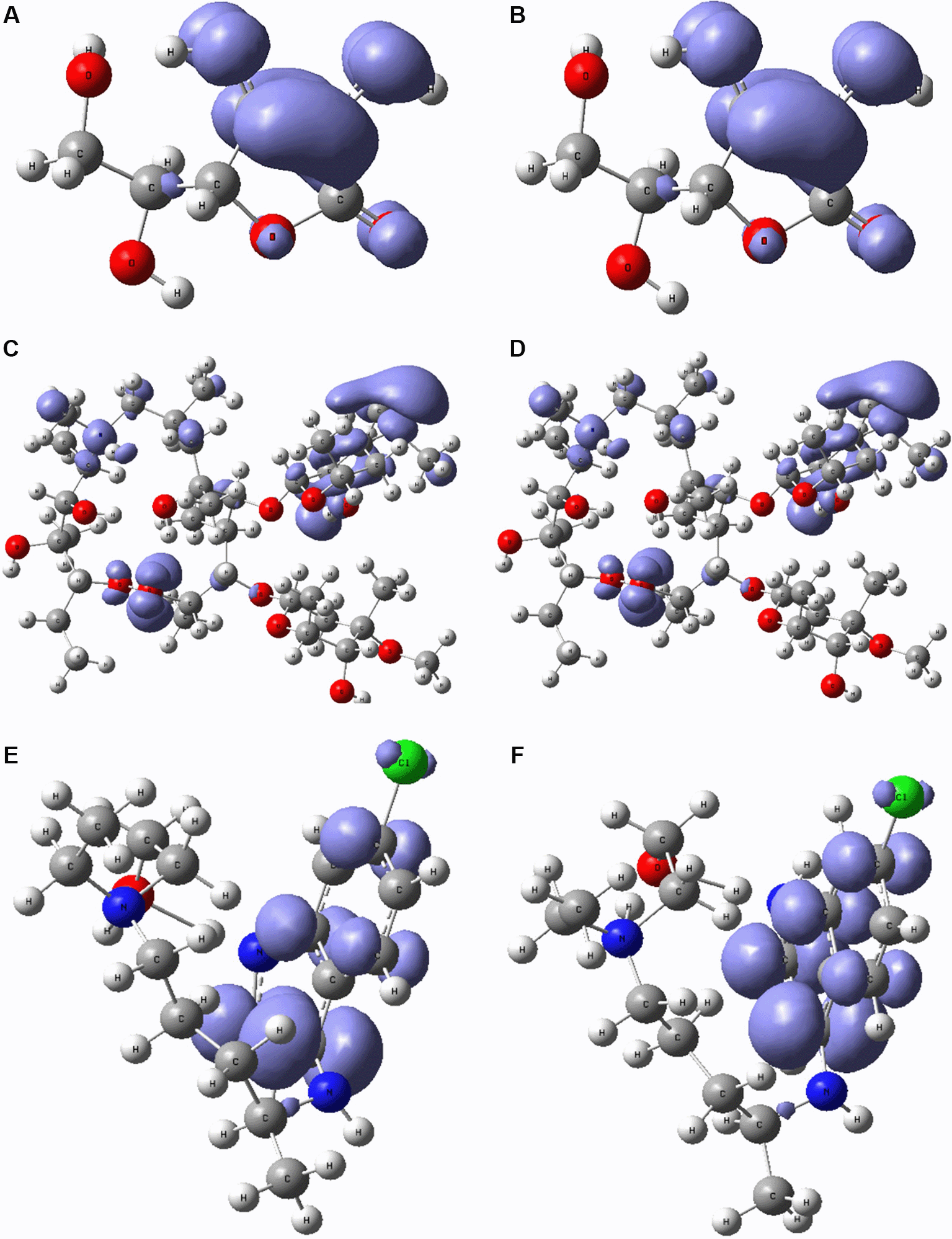 Figure 6 and Figure 7 show the Fukui functions and for the compounds selected. The Fukui function is associated with the susceptibility of a site to being attacked by electrophilic species, while represents the susceptibility of a site to being attacked by nucleophilic species. In these figures, we can see the functions of Fukui (-) and (+) on the identical zones in the molecular structure. These can be related to the stabilization process on the active site, showing the zones associated with global reactivity indices like electrophilicity and softness. These reactivity parameters can help understand the destabilization process and the bond formation (-H bonds) in non-covalent interactions. All these outcomes can be useful for the rapid assessment of the currently available antiviral drugs used for treating COVID-19 patients, which is crucial at this time of crisis, as well as for discovering newer drugs.