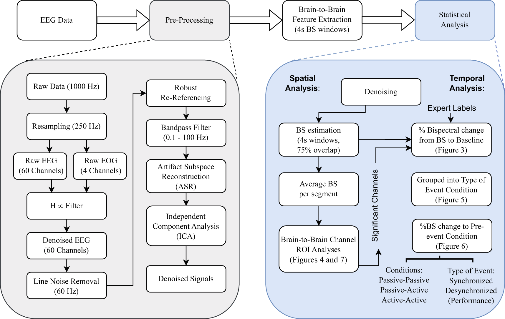 EEG signals were acquired at 1000 Hz and resampled to 250 Hz to reduce computational cost in subsequent calculations. Signals were bandpass filtered from 0.1 to 100 Hz using a 4th order Butterworth filter to remove unwanted noise. The PREP pipeline from the EEGLAB package (https://sccn.ucsd.edu/eeglab/download.php) was used as the initial step to clean the data.54 This procedure ensures the removal of power line noise, as well as a “true” average reference of the signals. EOG artifacts were removed from the EEG signals using an adaptive noise cancelling (ANC) framework, known as filter.55 Raw EOG signals were used as input in the filter with parameters γ = 1.15 and q = 1e−10 for removal of eye blinks, eye motions, amplitude drifts and recording biases simultaneously. The obtained signals were further processed using the artifact subspace reconstruction algorithm (ASR) included in the EEGLAB package.56 The ASR algorithm calculates the standard deviation of a “clean” portion of the signals in the principal component analysis (PCA) subspace, and reconstructs artifacts with standard deviations as κ times higher than in the clean portion. Here, a value of κ = 15 was chosen to remove remnants of eye movement and muscle artifacts. According to,57 κ values between 10-20 are recommended to reduce artifacts and at the same time preserve the content of EEG signals. As a final step, independent component analysis (ICA) was performed on the data and suspicious components (eye, muscle, electrode popping) were removed before projecting back the signals. A graphical representation of the pre-processing steps is presented in Figure 2, as well as feature extraction and subsequent signals analysis.
