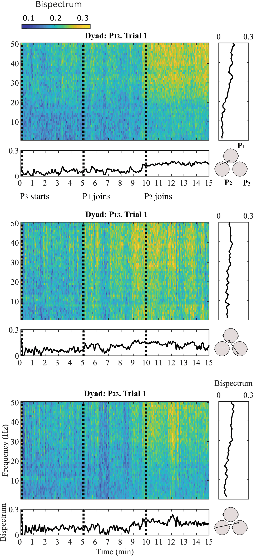 A general representation of the bispectral dynamics between pairs of participants during Trial 1 in shown in Figure 3. Here, normalized bispectrum is presented for the three participant pairs (P12, P13 and P23) in separate insets. In each inset, four plots are shown: a bispectrogram (top left), the average bispectrum at each time window in the gamma band (bottom left), the average bispectrum at each frequency bin (top right) and the most significant channel combination found at gamma band, between each dyad (bottom right).