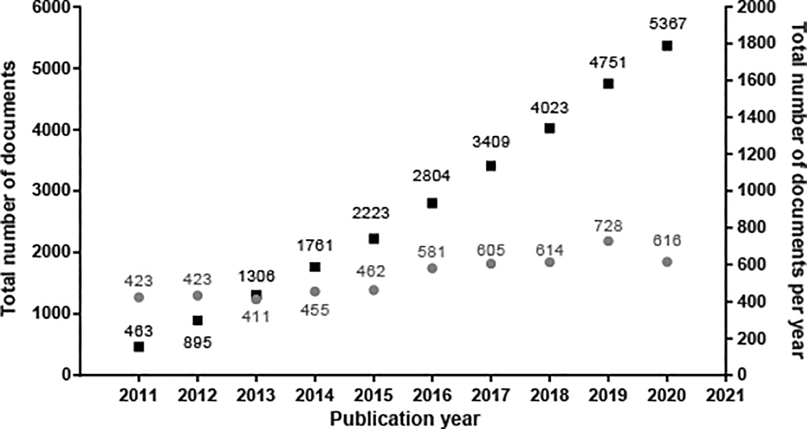 The evolution in the number of patent documents (applications and grants) from 2011 to 2020 is presented in Figure 1. From 2013 to 2015, the number of patent documents produced annually remained relatively constant. However, as of 2015, a gradual increase in annual applications began, presenting a maximum peak in 2019. For 2020, the number of submitted patent applications decreased discreetly since the search results were inconclusive, considering that we did not carry out the query at the end of the year.