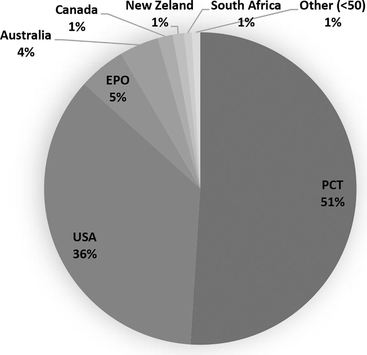We integrated a core collection of published patent documents constructed to encompass all stem cell applications from the USPTO, the EPO, WIPO's Patent Cooperation Treaty (PCT) filing system, and seven countries, including Australia, Canada, New Zealand, South Africa, United Kingdom, Israel, and South Korea (Figure 2). PCT filings represent the majority of global patent documents, followed by the USA domination as the most prominent target market. The fact that patent documents are being filed through the PCT suggests the intention to protect the invention simultaneously in different countries.