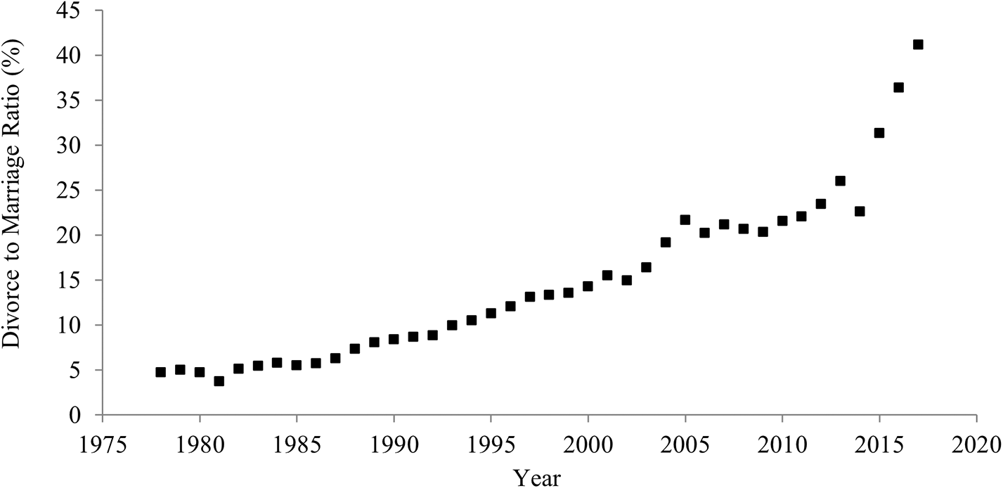 As the measure of divorce rates, the divorce-to-marriage ratio was used. Data covered the period between 1978 and 2017 and came from the National Bureau of Statistics of China (2018). Data on household sizes covered the period between 1953 and 2017 and were drawn from the National Bureau of Statistics of China (2018).