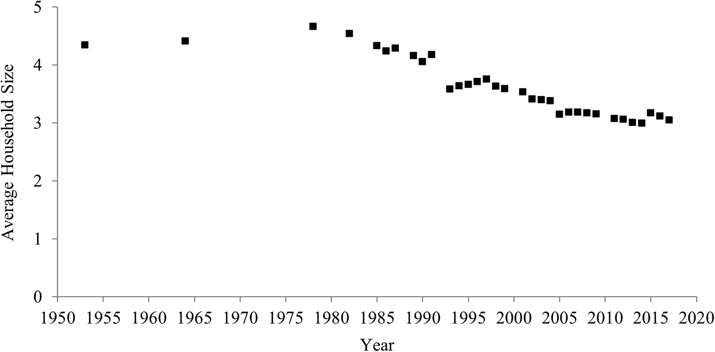 Figure 2 indicates temporal shifts in household size between 1953 and 2017 in China. Household size declined over the past 60 years. In 1953, the average household consisted of 4.3 people, but in 2017 the average was 3.1 people. The correlation between year and household size was highly negative (Table 1), which indicates a rise in individualism.