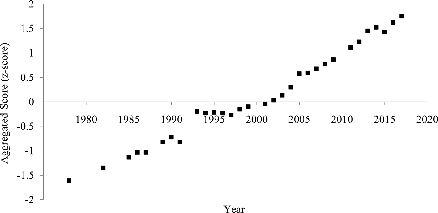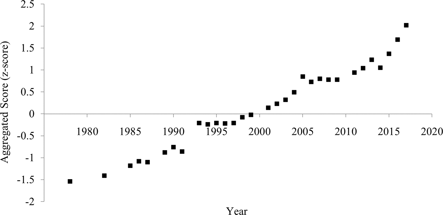 The aggregated score of divorce rate and household size showed a clearer and more consistent pattern of increased individualism than each indicator (Figure 4). The correlation between the year and the aggregated score was strongly positive (Table 1), suggesting an increase in individualism.