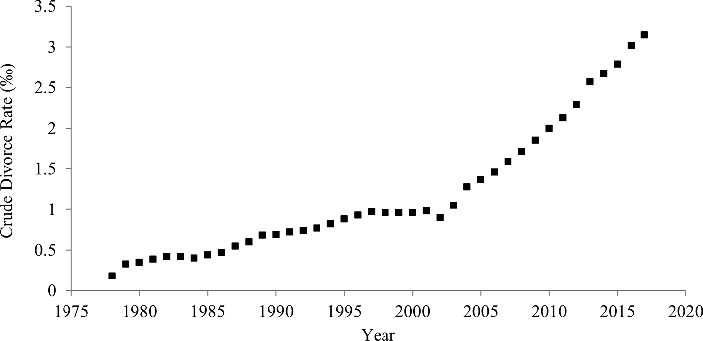 As the measure of divorce rates, the divorce-to-marriage ratio was used. Data covered the period between 1978 and 2017 and came from the National Bureau of Statistics of China (2018). Data on household sizes covered the period between 1953 and 2017 and were drawn from the National Bureau of Statistics of China (2018).