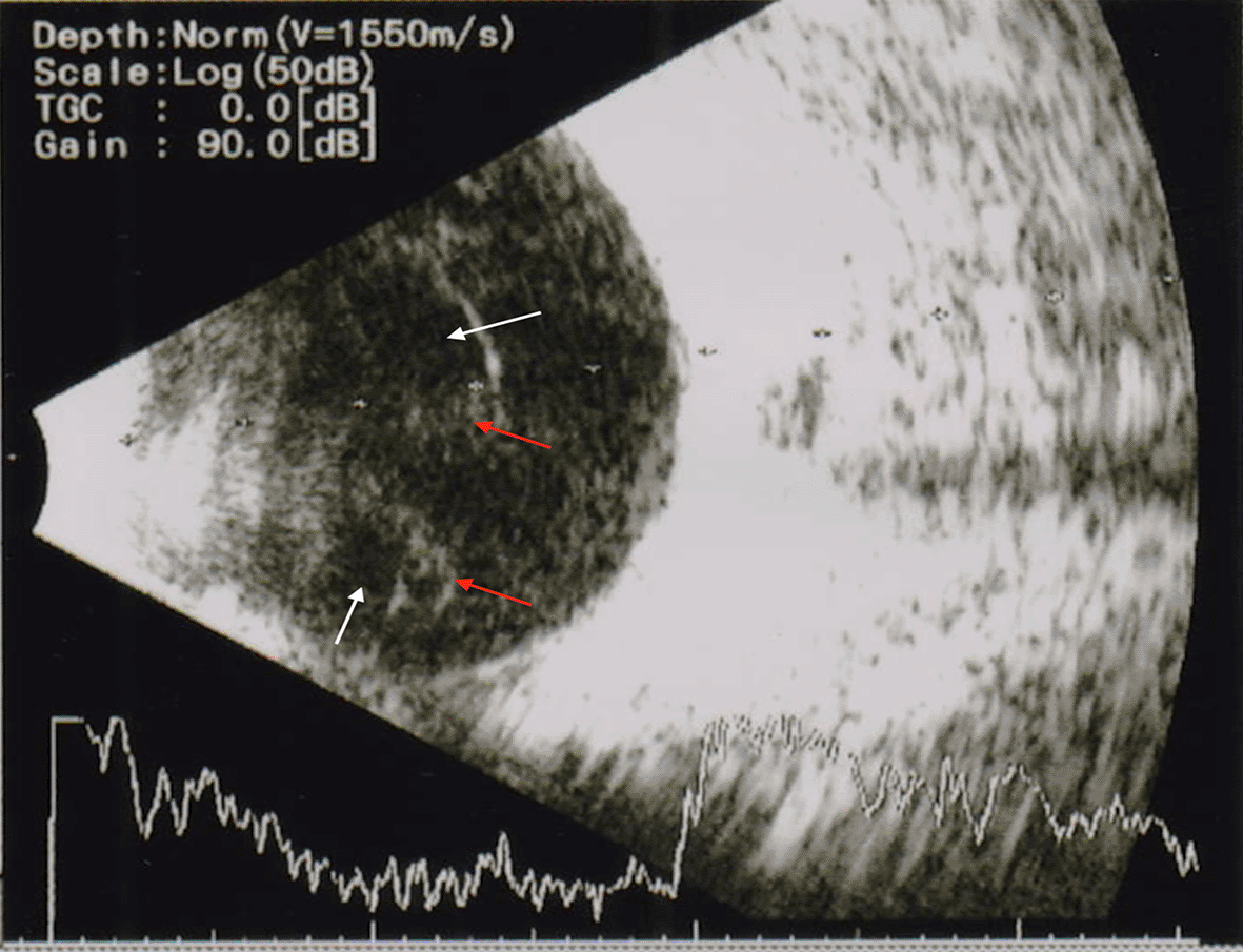 On ocular examination, she only perceived light with an inaccurate ray’s projection in the left eye and 6/6 in the right eye. There were tense lid edema and proptosis (Figure 1) with severely restricted eye movement in all gazes. There were severely chemosed conjunctiva, circumcorneal congestion and edematous cornea, and no further visibility of the anterior and posterior segments. A B-scan ultrasonogram (USG) showed moderate hyperechogenic shadows with cavitations in the vitreous cavity, which disappeared at low gain with attached retina and increased choroidal thickness in the left eye (Figure 2). So diagnosed as a case of left-sided orbital cellulitis with endogenous endophthalmitis (EE).