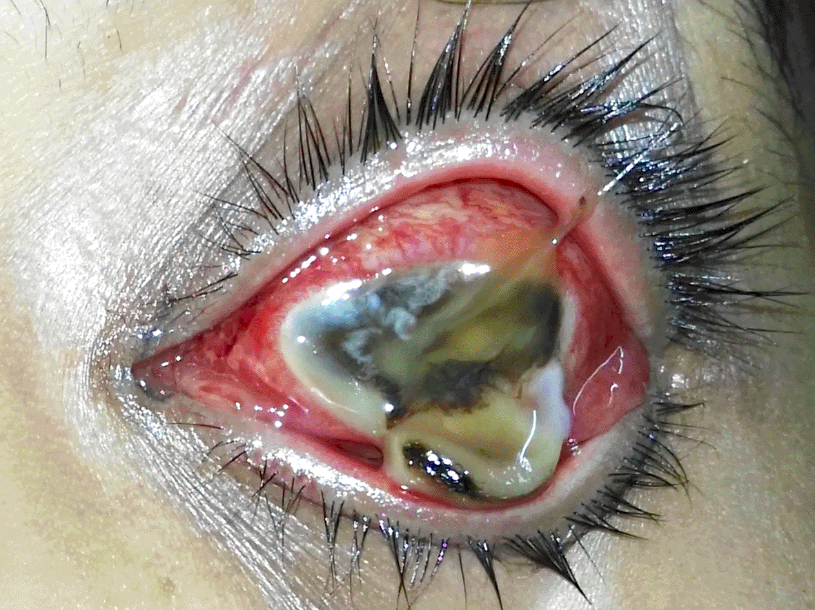 After counselling the patient and her husband, evisceration of the left eye was advised. Intraoperatively, the sclera-corneal melting was evident, and completely removed all intraocular contents. All removed ocular contents were sent for microbiological analysis, and significant growth of Staphylococcus aureus (SA) was reported. We continued the previous treatment regimen during the immediate postoperative period.