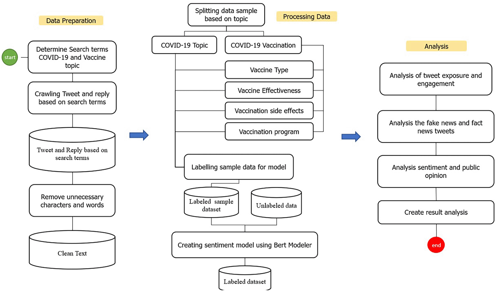 The searching terms are listed in Table 1. After the preprocessing stage, subsequently, the data was cleaned from several elements such as emoticons, hashtags, non-alphanumeric characters, and URLs. The lower-text was used to convert all Twitter text to the lowercases, then we removed the punctuation in the Tweet text. The cleaned data that had gone through these stages were then labeled manually. The data was labeled into classifications, namely COVID-19, COVID-19 types and brands of vaccine, vaccine effectiveness, vaccine side effect, and vaccination (program). The labeling was then carried out into several classes, which were tweet exposure and engagement analysis, differentiating the fake and the fact tweets, also sentiment and public opinion analysis (Figure 1).